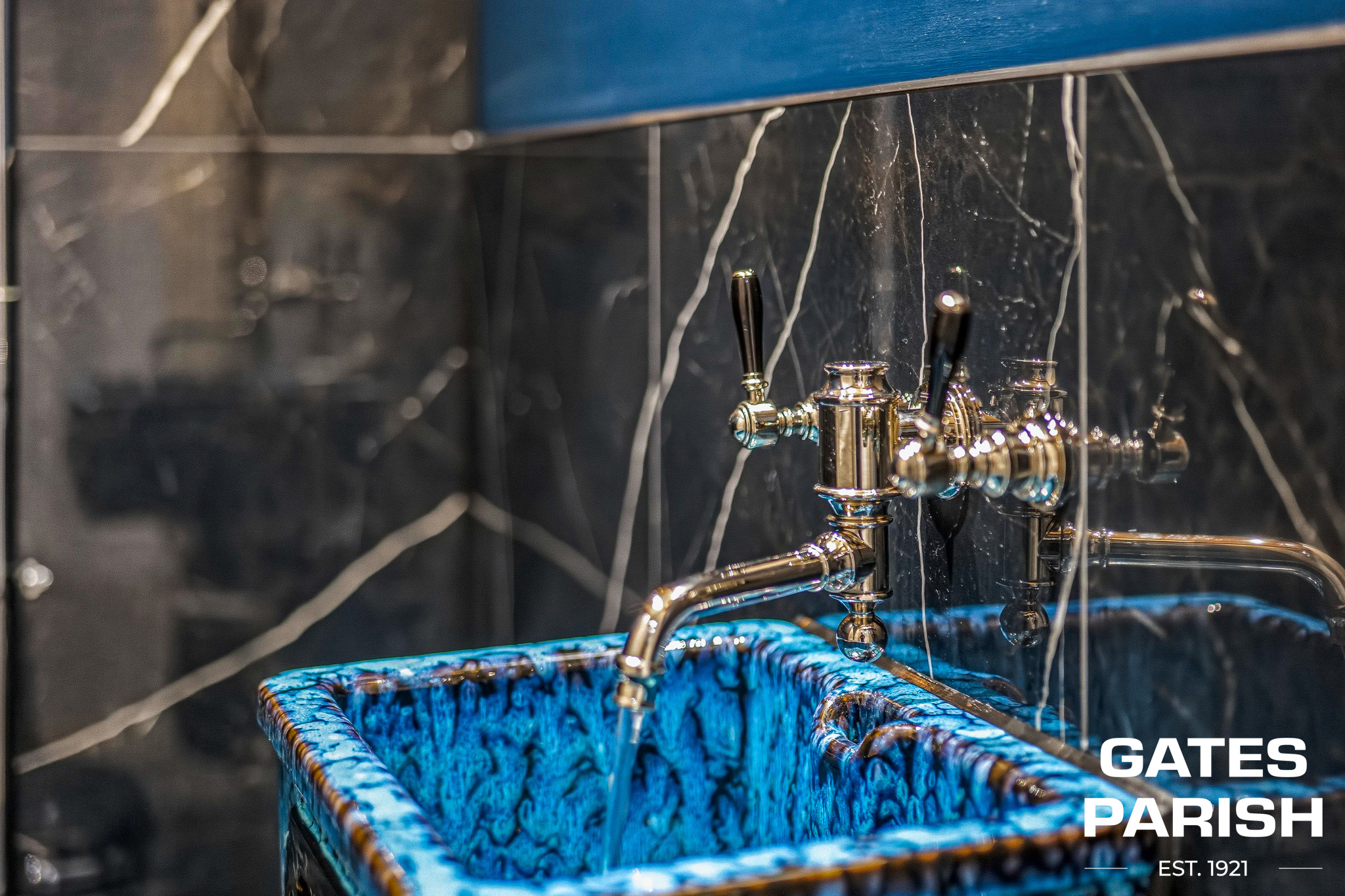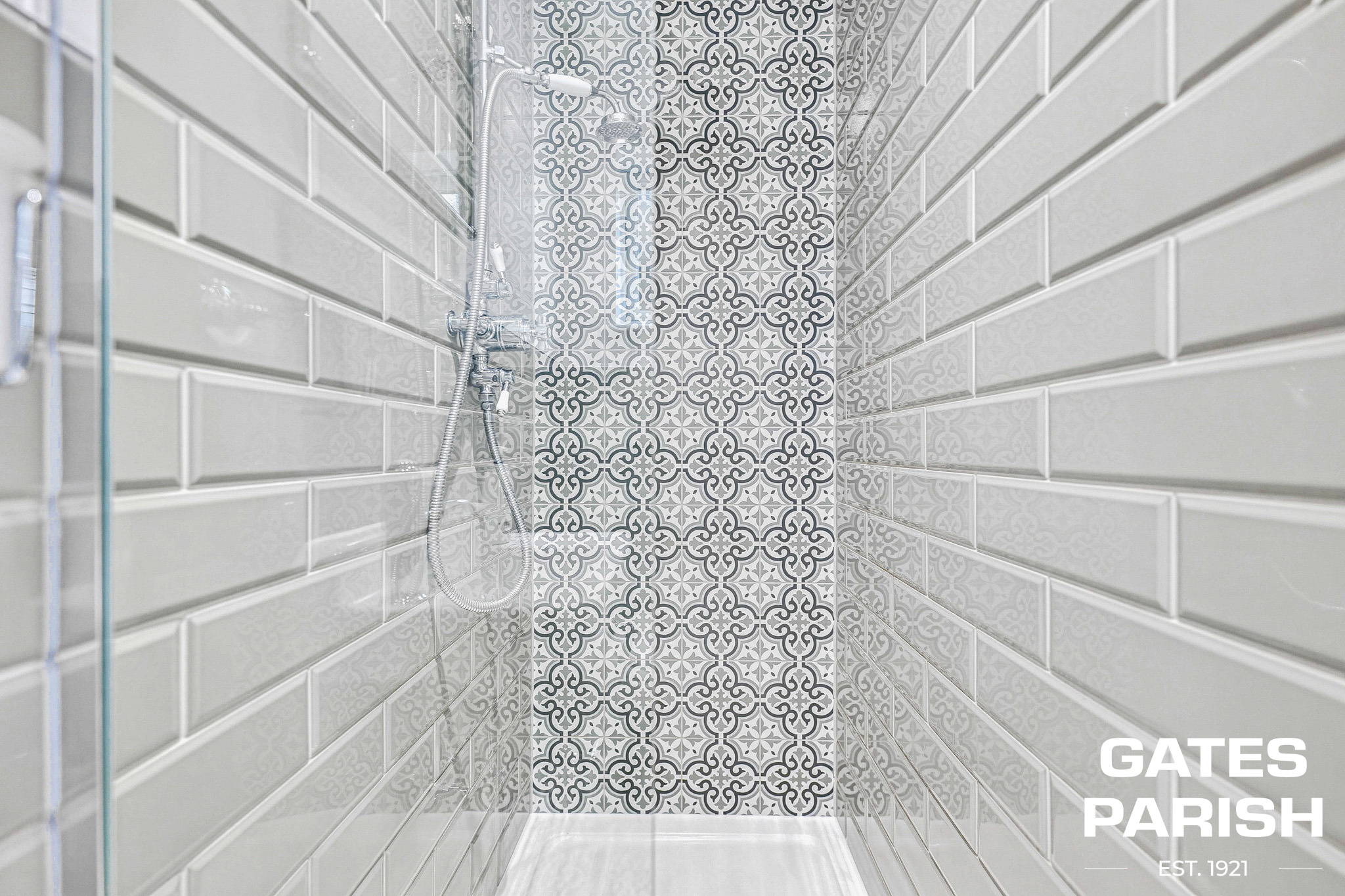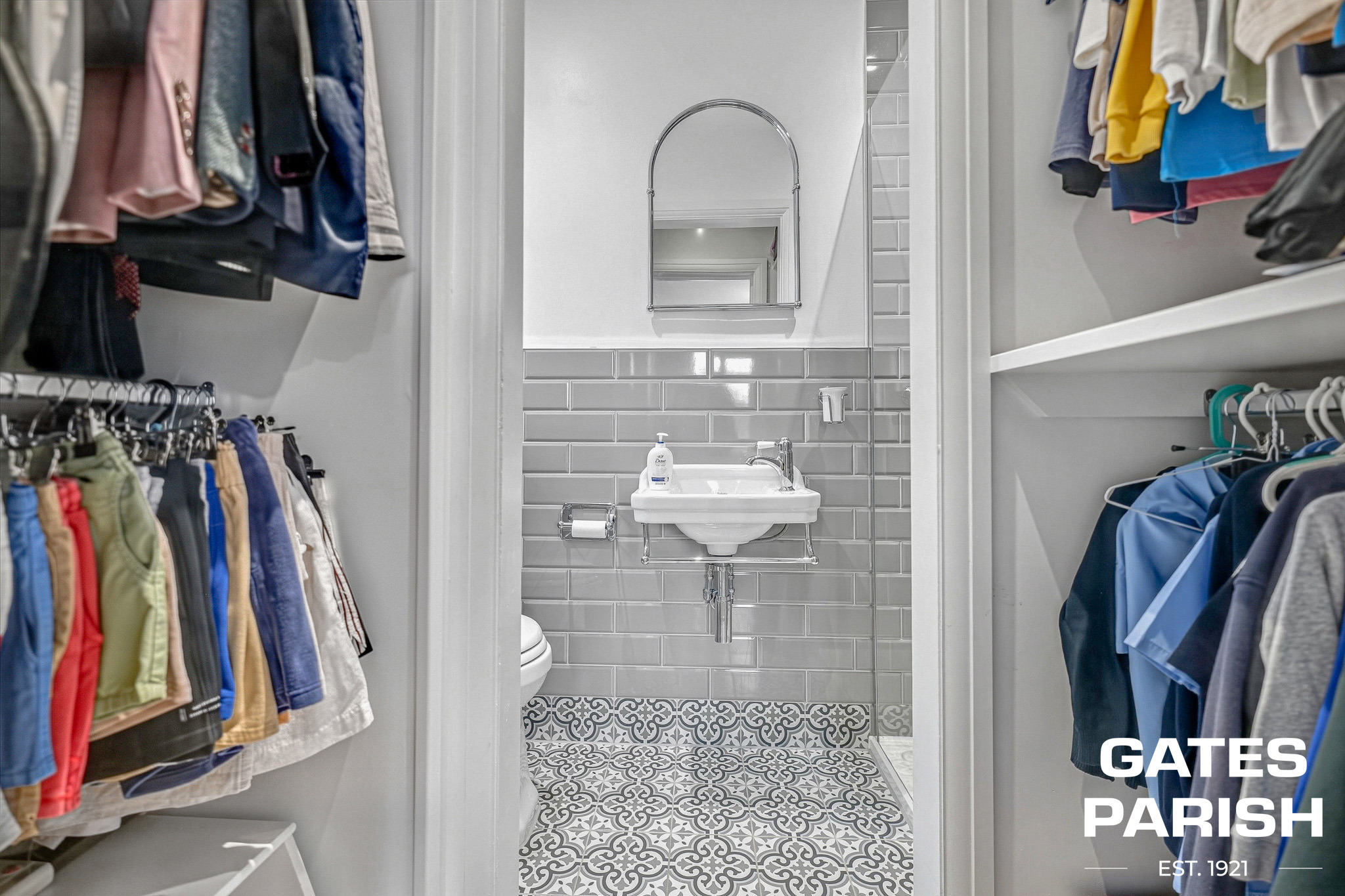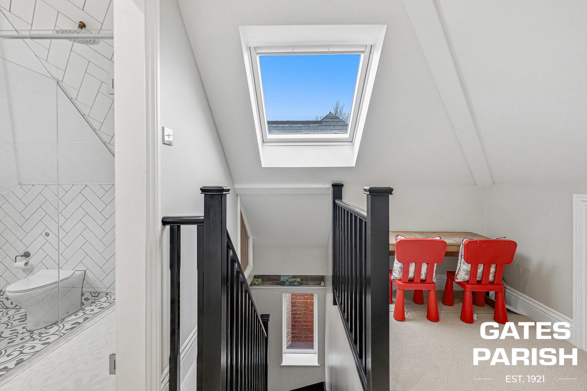 To the front of the property, the elegant living room features a charming bay window, feature fireplace, and engineered oak flooring, creating a warm and inviting setting. A stylish cloakroom is fitted with a Burlington high-level cistern WC and London ‘Thomas Crapper’ sink, complemented by automatic wall lighting on entry. There is also a versatile playroom with space for a built-in television and a dedicated media and games cupboard, with all TV and data points wired back to this central hub.