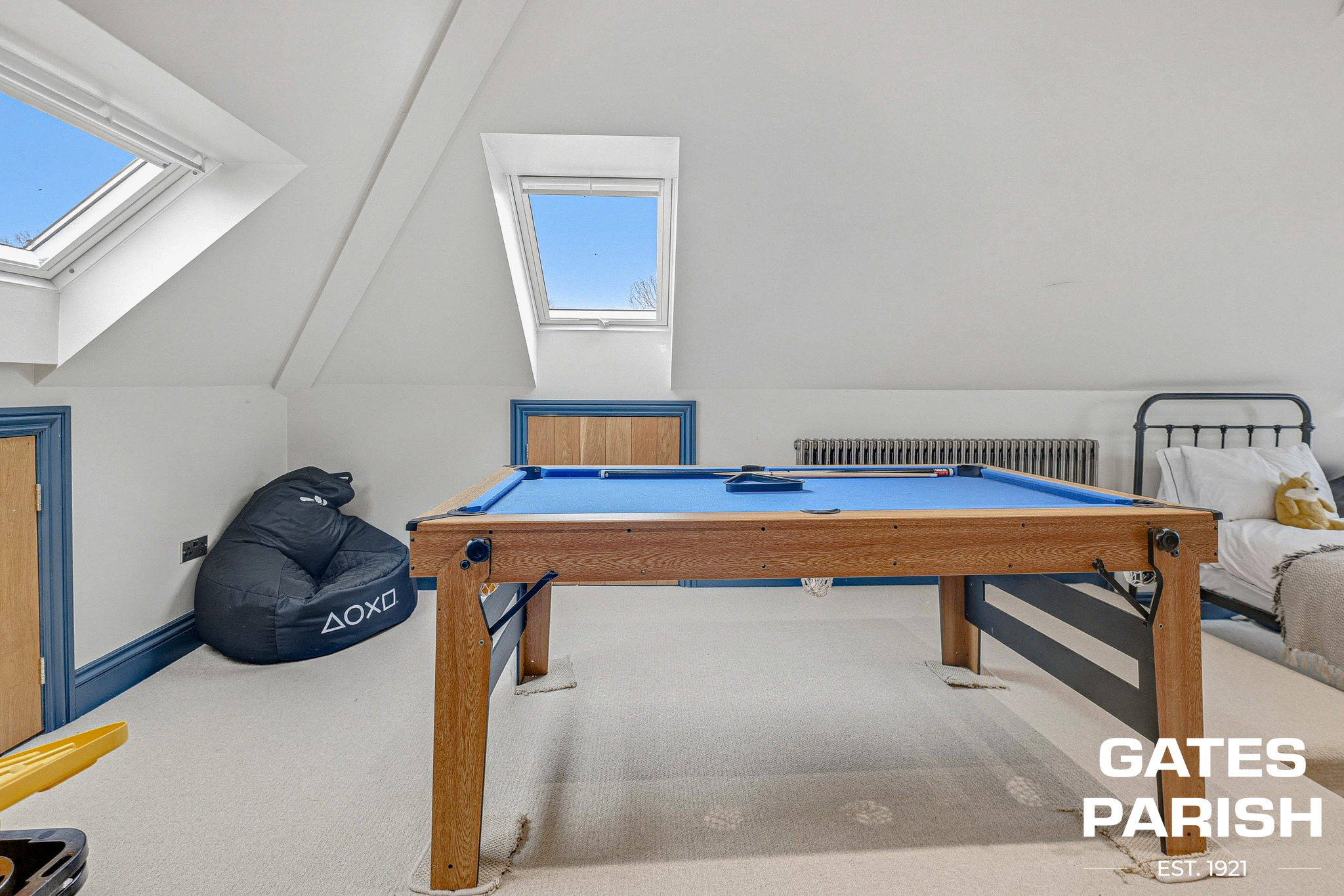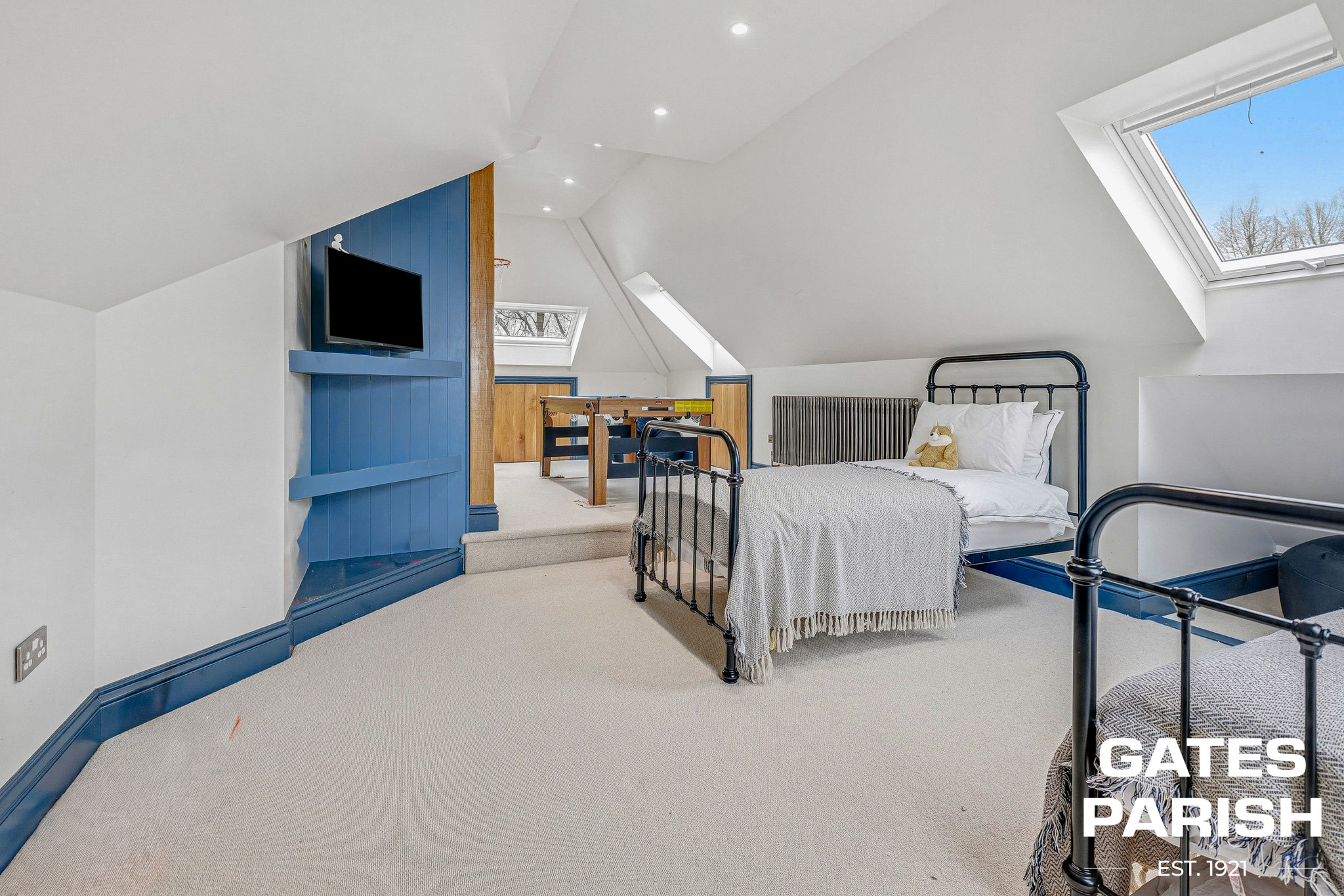 The loft level provides an outstanding additional bedroom suite, featuring built-in wardrobes, TV shelving, a shower room, and a landing play area. The room offers extensive eaves storage around the perimeter, oak eaves doors and wardrobes, a striking oak feature beam, and a second laundry chute via the bathroom. From this elevated position there are impressive views across London.