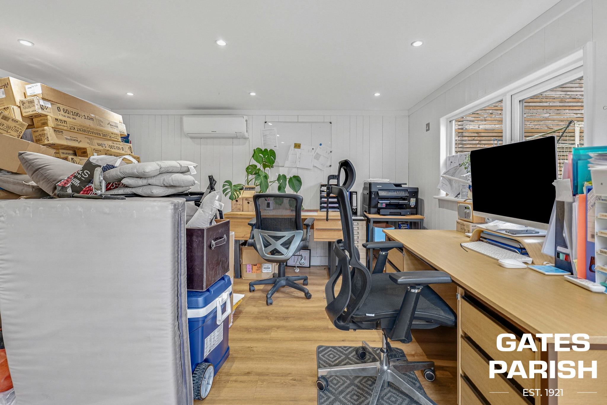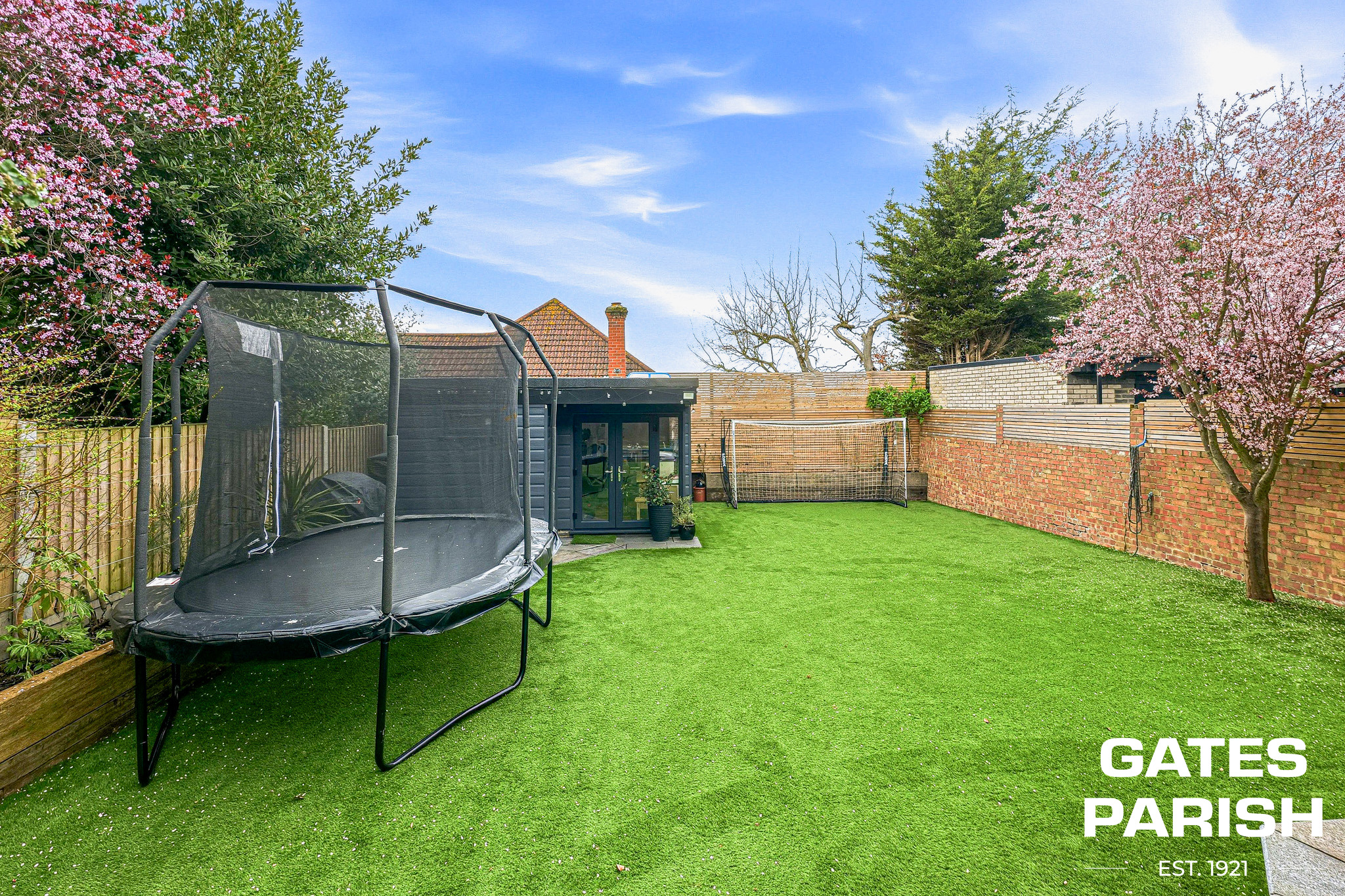 Externally, the west-facing garden has been beautifully landscaped with oak sleeper raised flower beds, a granite patio area, and artificial lawn for low-maintenance living. Both hot and cold outdoor taps are installed, ideal for family use. A separate outbuilding provides a fully fitted home office with spotlights and a wet shower room including WC and basin, perfect for remote working or guest accommodation.