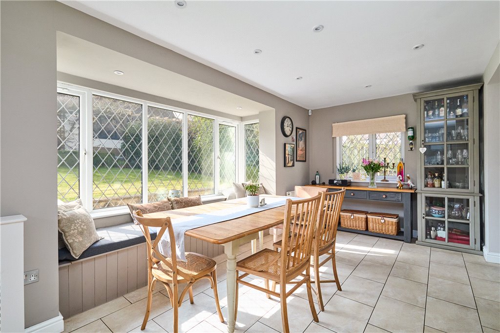 The dining area is particularly light, having the benefit of a deep bay window with a very pleasant window seat. Double doors open out onto the rear terrace. There is also a large utility room, accessed from the kitchen and side entrance, and a guest WC.
