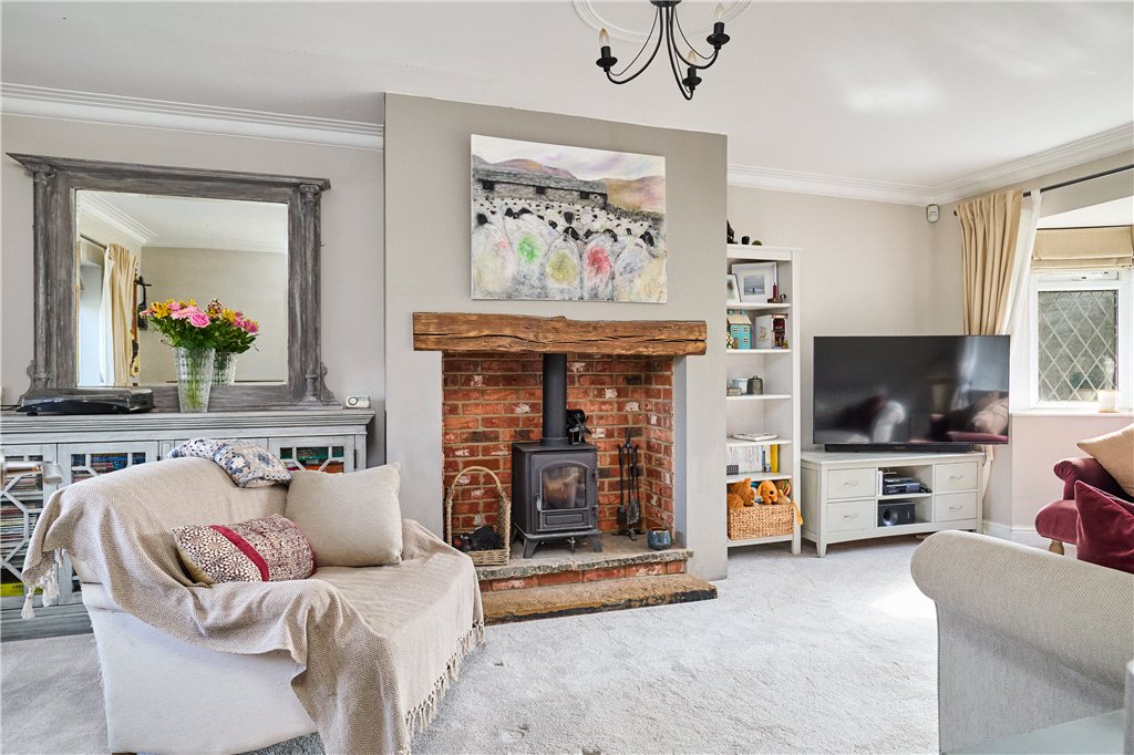 The spacious living room has a window to front as well as a bay window to rear overlooking the garden, affording a good deal of natural light. A brick fireplace has a wooden mantel and an inset wood burning stove.