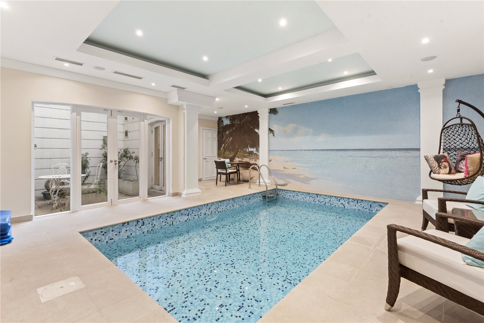 Upon entering the house a bright and open entrance hall leads to a dinning hall with access to a conservatory and a patio perfect for summer, located on the lower ground floor is a private indoor pool with own shower room, fully equipped modern kitchen with access to a private patio from pool room and kitchen, as well as one double en-suite bedroom. The first floor leads into a open and bright drawing room and a home office space. Following a beautiful wooden staircase to the master en-suite bedroom with a walk-in dressing room which takes up the whole second floor, as well as a a laundry room few steps down, a further five bedroom are located on the third and