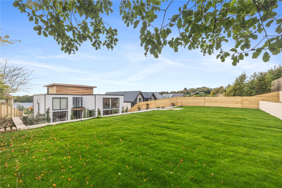 Outside, the garden has been arranged across levels to maximise both usability and outlook. A paved terrace sits directly off the kitchen, creating an easy transition for outdoor dining, while the swimming pool becomes a real focal point of the space. A lawned section offers room for children to play, and the upper level presents exciting potential for a future pool house and outdoor kitchen area.