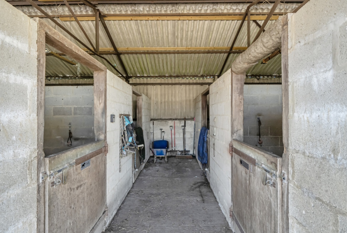 The equestrian facilities are particularly noteworthy, centred around a floodlit arena allowing for year-round schooling in complete privacy. The stable yard is well arranged, comprising six loose boxes, barns, and a dedicated tack room, ensuring practicality and ease of use. The pastureland is thoughtfully divided into multiple paddocks, ideal for rotational grazing and flexible management. All fields are enclosed by post-and-rail fencing and benefit from a direct water supply, making the setup both efficient and highly functional.