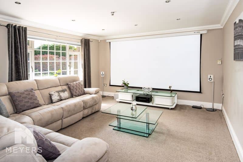 Located next to the kitchen and accessed from the hallway. The current owners have utilised this room as a home cinema room but could become a formal dining room if required. The room has an aspect over the front and is generous in size. The cinema equipment includes a JVC projector, pull down screen and speakers – all available subject to negotiation.