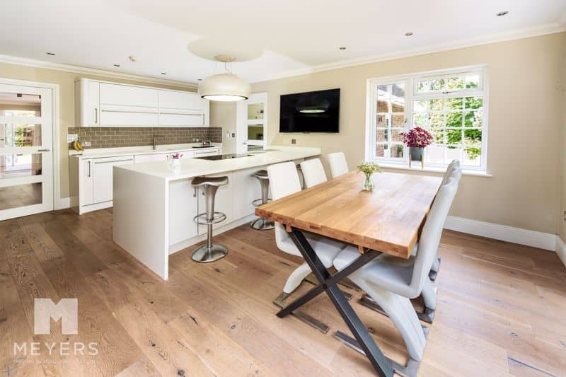 A part glazed internal door from the hallway leads into the kitchen/breakfast/dining room which has been fitted with a modern and high specification kitchen with a central island and breakfast bar which accommodates four/five stools. The comprehensive kitchen offers a range of matt white floor units with a Corian worksurface over with an inset sink and drainer, tiled splash back and hinged wall cupboards over and features a hot water Quooker tap and integral dishwasher. The island has been fitted with a five ring Bosch induction hob and motorised Elica extractor over. A further bank of wall mounted units are finished in a contrasting wood grain ash grey colour, and fitted with a full length fridge and freezer, pull out pan drawers and mid height Neff appliances include a single oven, combination microwave oven, warming drawer and steamer oven.