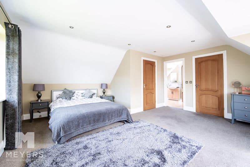 A double aspect bedroom which provides a wonderful room for guest or if ground floor living is required. There is ample room for a king or super king bed with freestanding furniture. The en suite shower room comprises a low-level W.C with enclosed cistern and flush, wall mounted towel rail, corner wash handbasin with tiled splashback and mixer tap with vanity storage unit below and a walk-in shower cubicle with a sliding glass door and wall mounted Grohe shower with shower attachment over and wall mounted jets. Enclosed with tiled walls and flooring.