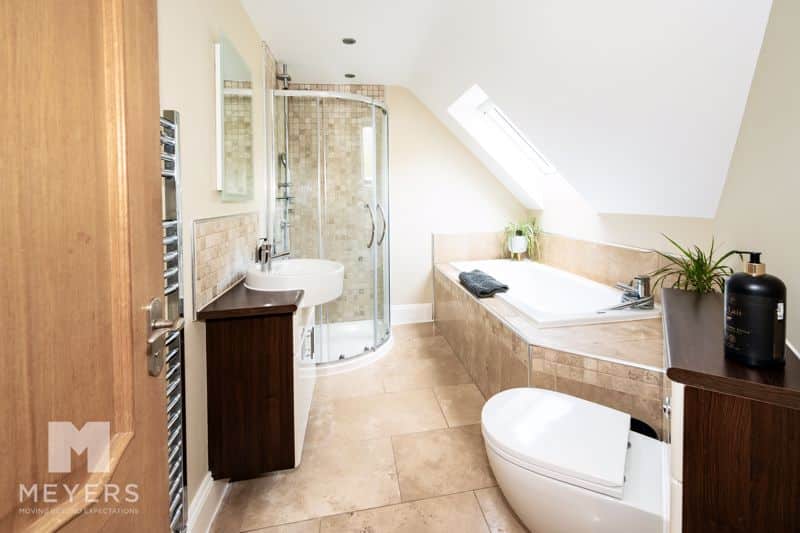 The family bathroom is a great size and comprises a two person panelled bath with mixer tap and separate shower attachment, corner walk-in shower enclosure with Grohe shower valve and shower attachment over, wall mounted towel rail and a bank of storage cupboards with a fitted low-level W.C, ceramic wash hand basin with mixer tap and mirror over. Enclosed with tiled floors and walls.
