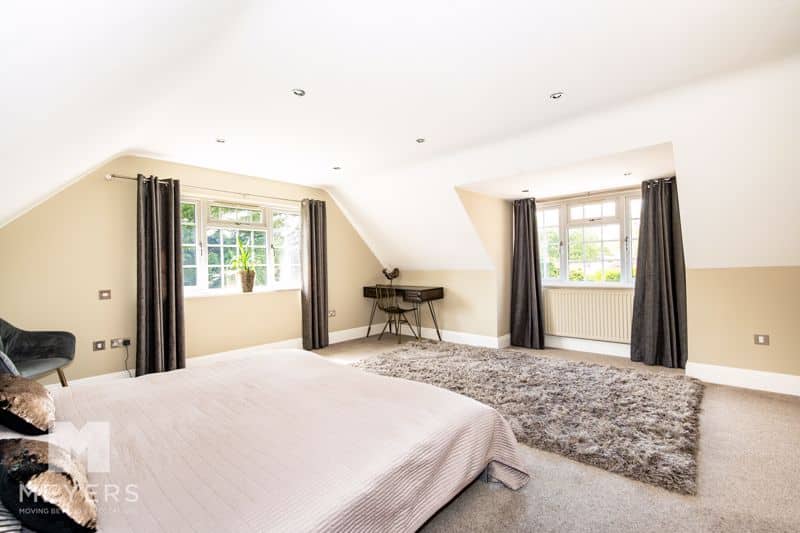 The largest bedroom and could be used as the primary. This bedroom has a dual aspect to the front and side elevation and benefits from a walk-in wardrobe with built-in shelving and rails.