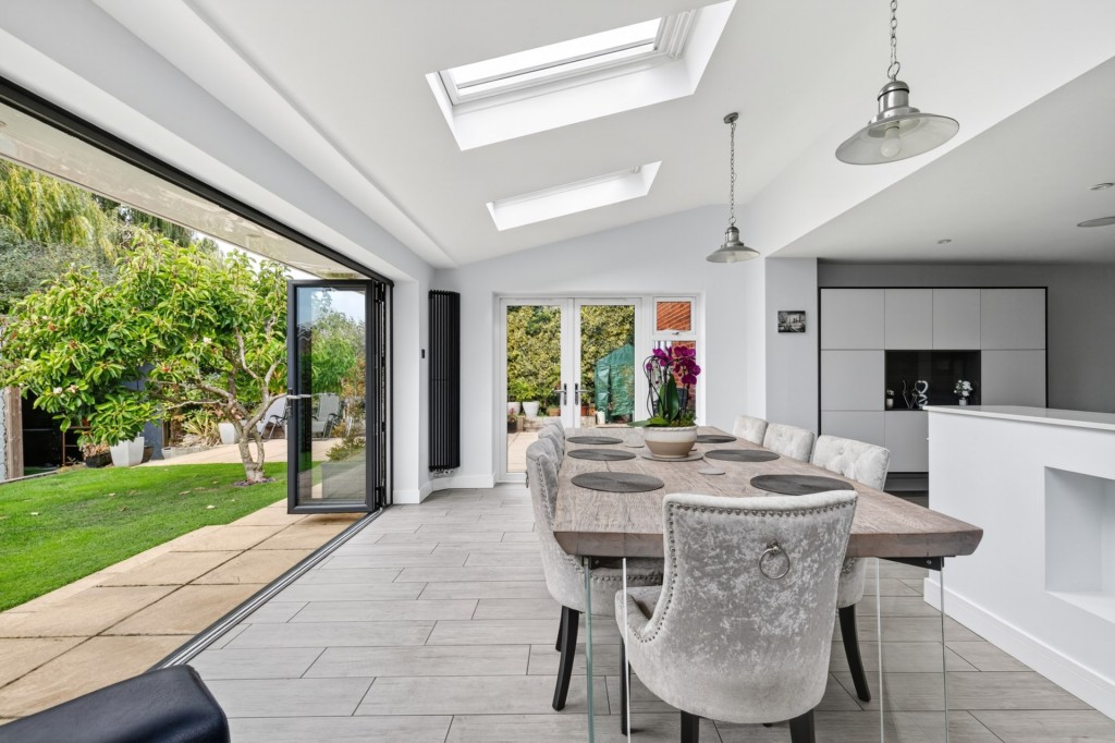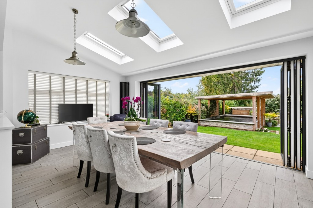 Inside, the accommodation is both spacious and versatile, comprising three elegant reception rooms that provide a range of living and entertaining spaces. The heart of the home is a beautifully appointed kitchen/dining room, ideal for both everyday family meals and hosting guests. The bi-folding doors offer wonderful viewings out on to the lake. Downstairs also features a cloakroom and utility room.