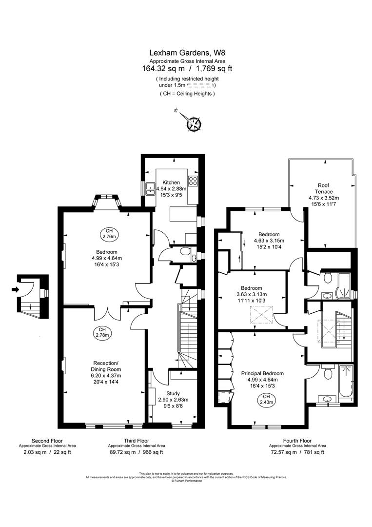 The third floor consists of a spacious main reception room with views directly over looking the gardens. A double bedroom / dining room adjoins the reception which can be blocked off, guest loo, separate kitchen and study are also found on this floor. The fourth floor has a further three double bedrooms and two bathrooms.
