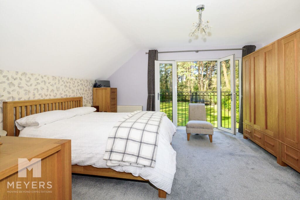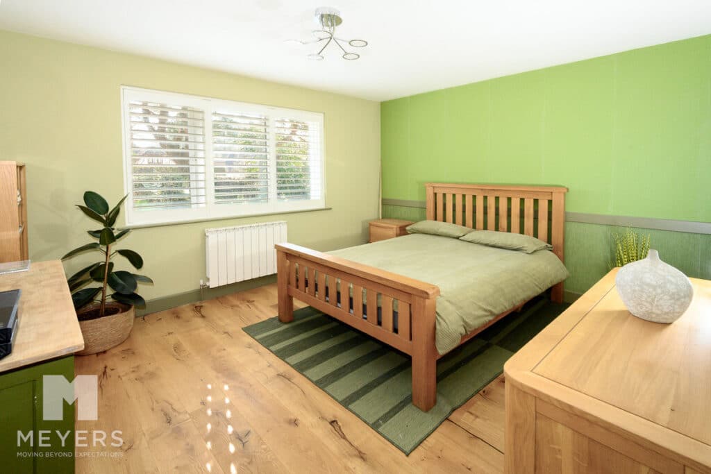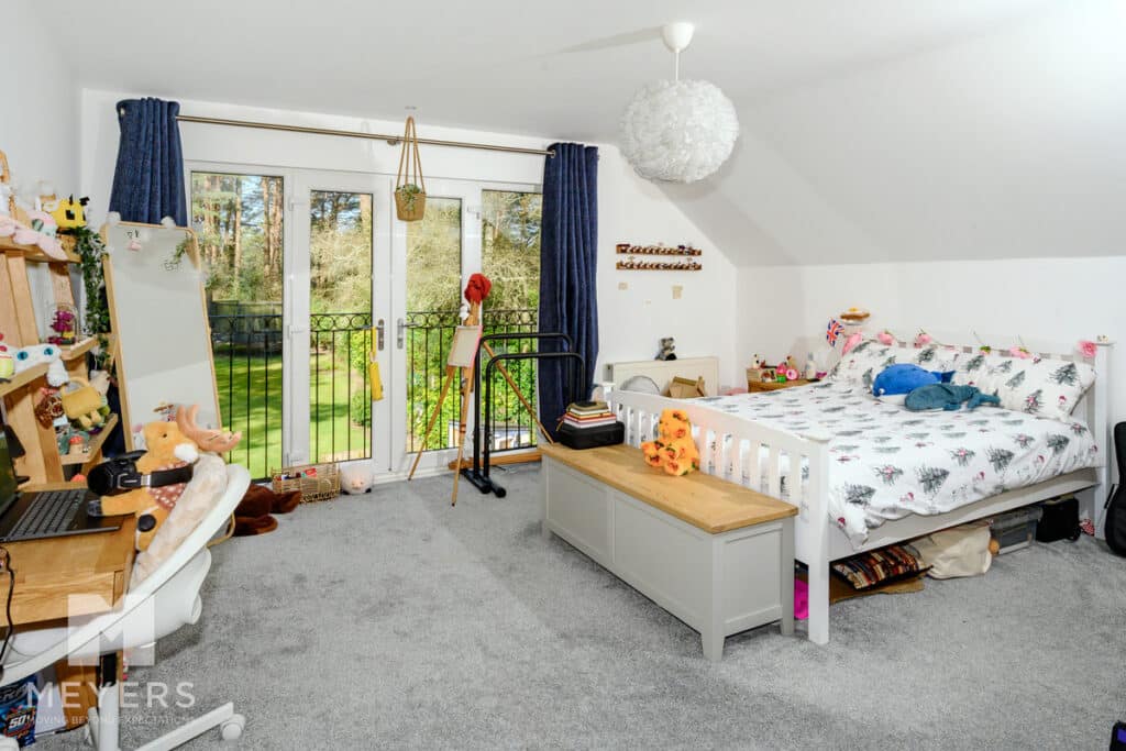 Bedroom two is a spacious and elegant double room, also benefitting from French doors and a Juliet balcony overlooking the garden. It provides excellent space for a king-size bed and additional furnishings, making it ideal for family or guests.