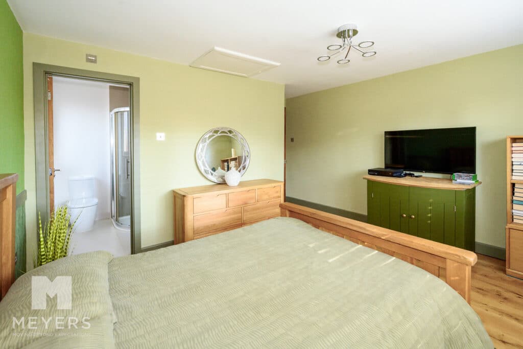 A generously sized double bedroom on the ground floor provides excellent flexibility, ideal for guests, multigenerational living, or as an alternative principal suite. It offers ample space for a king-size bed and freestanding furniture. The en suite is well appointed, featuring a low-level WC, wash hand basin, and a walk-in shower with a glazed enclosure.