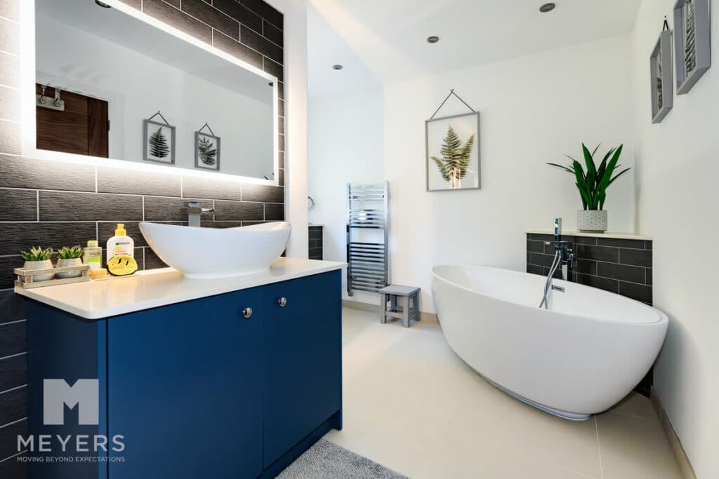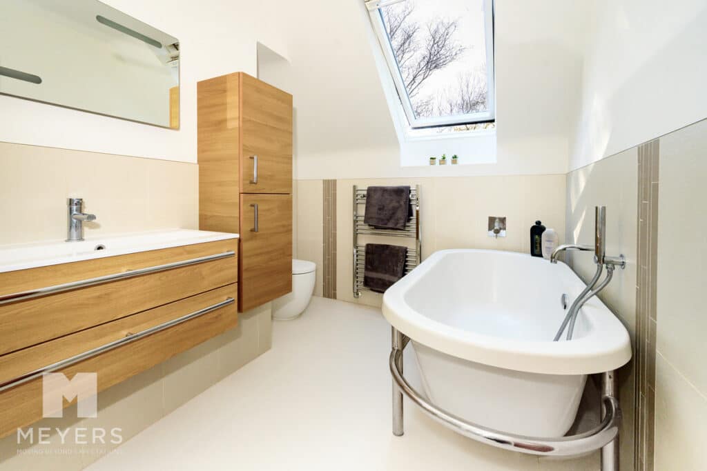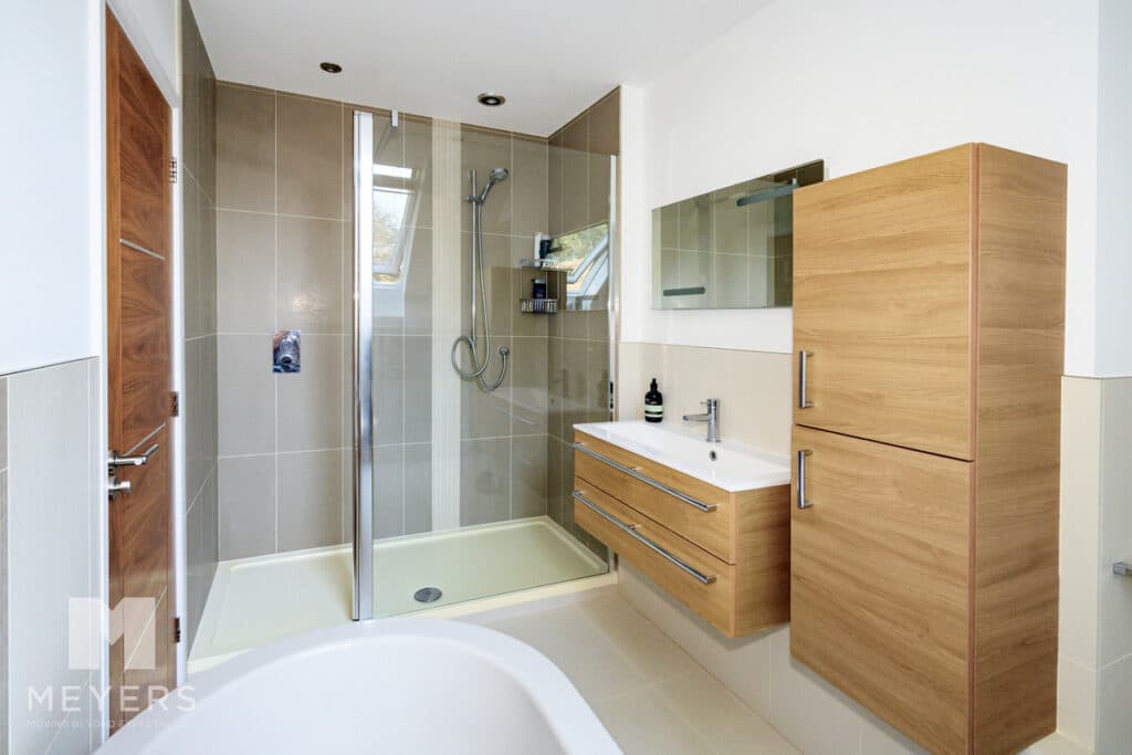 The family bathroom is finished to an exceptional standard, offering a luxurious and contemporary space. It features a freestanding bath, a walk-in rainfall shower with separate attachment, a wall-hung WC, and a sleek vanity unit with an illuminated mirror. High-quality tiling completes the sophisticated design.