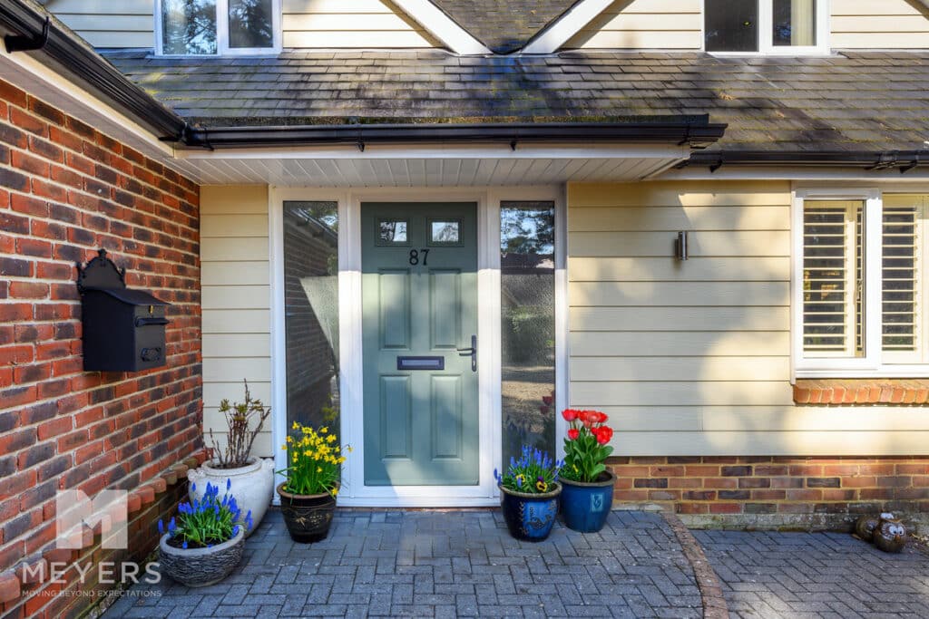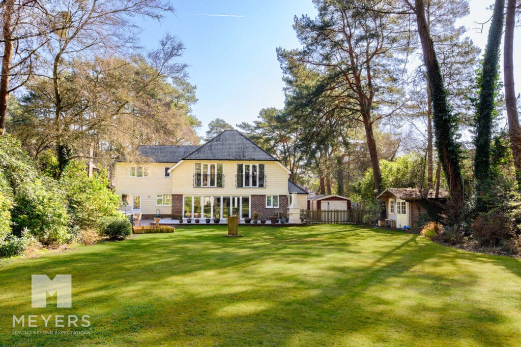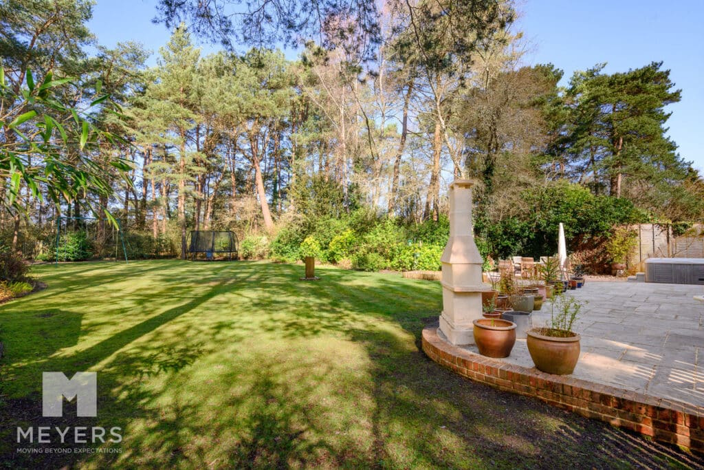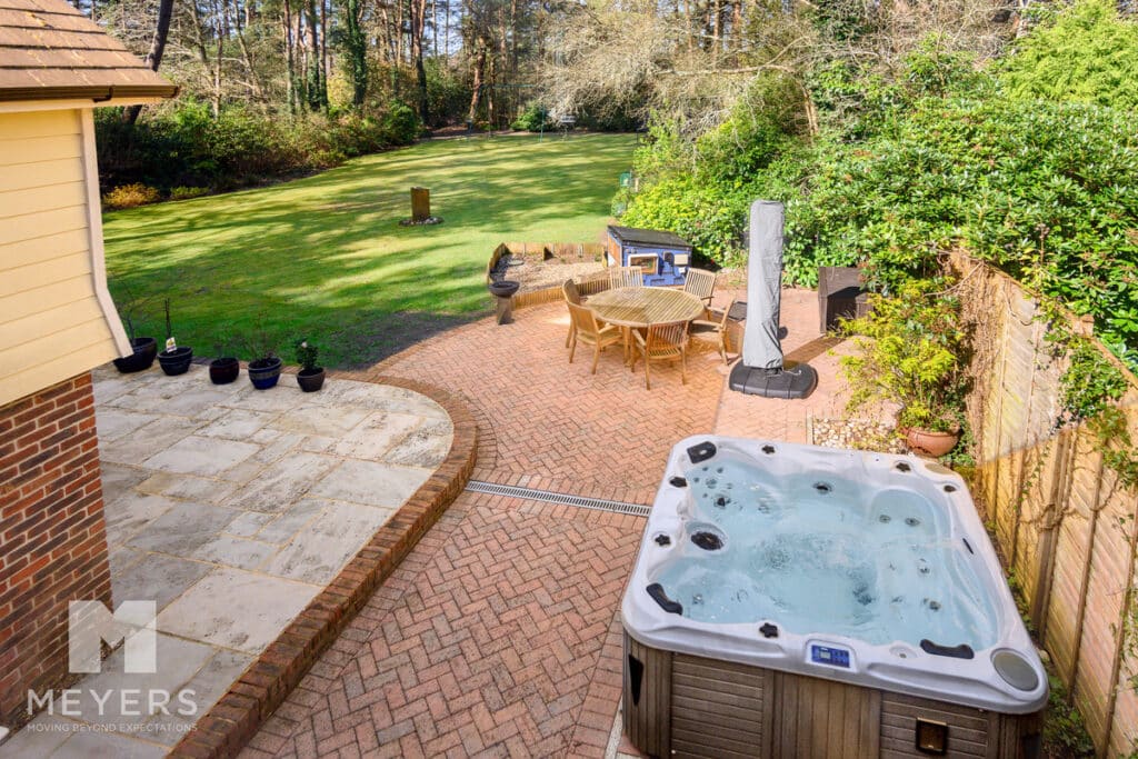 The rear garden is a particular feature of the property, offering a beautifully maintained and private outdoor space. A sandstone patio and block-paved terrace provide an ideal setting for alfresco dining and entertaining, seamlessly extending the living space outdoors. The garden is predominantly laid to lawn and bordered by mature trees and hedging, creating a tranquil and secluded environment. A gated access leads directly onto Lions Hill Nature Reserve, offering immediate access to stunning heathland walks. Further features include a summer house and a hot tub, available by separate negotiation.
