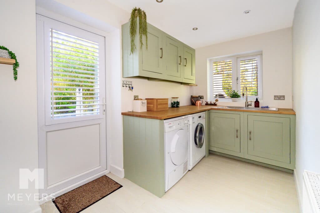The utility room continues the high-quality finish of the kitchen, offering an excellent range of storage with matching units and oak work surfaces. It includes a stainless steel sink, space for laundry appliances, and direct access to the side garden via a partially glazed door, making it both practical and well considered.