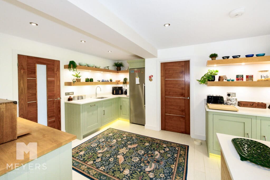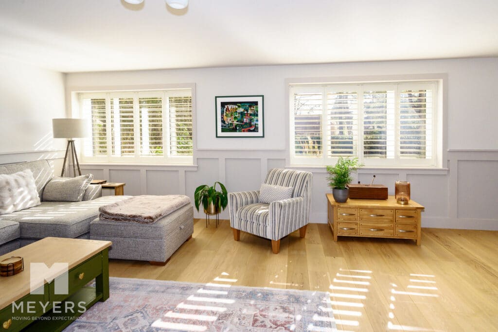 The sitting room is a beautifully proportioned and inviting space, designed for both relaxation and entertaining. It is seamlessly connected to the kitchen/dining room while also accessible from the hallway, creating a wonderful sense of flow. The room offers ample space for multiple seating arrangements and includes a dedicated area ideal for a home office or reading nook. A bespoke media wall with integrated shelving and an inset fireplace provides a striking focal point, while solid oak flooring, elegant wall panelling, and plantation shutters complete the refined aesthetic.