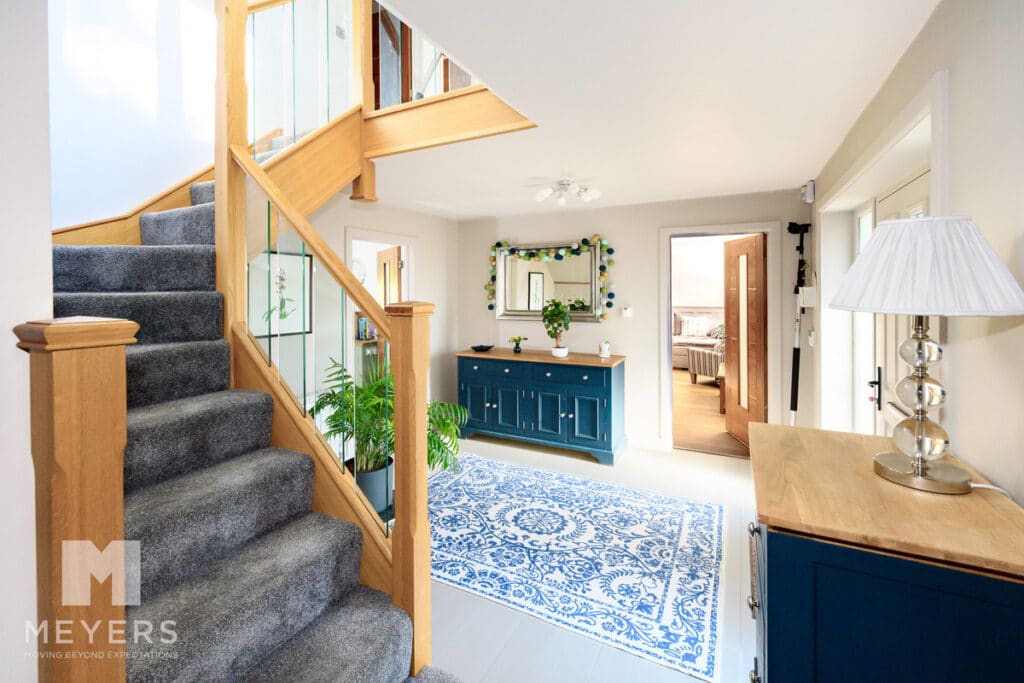 A composite front door with side-panel glazing opens into an impressive and welcoming entrance hallway, immediately conveying a sense of space and light. Finished with elegant tiled flooring, the hallway provides access to all principal ground floor accommodation, with a well-appointed storage cupboard for coats and shoes, additional under-stairs storage, and space for statement furniture. Stairs rise gracefully to the first-floor landing.