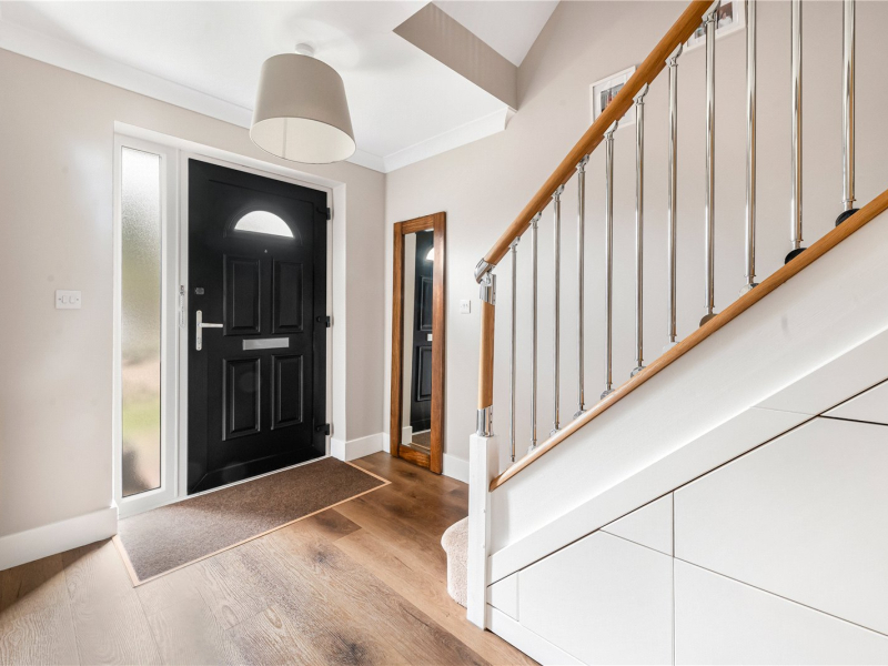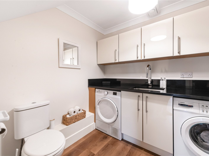 Upon entering, a welcoming hallway provides access to stairs rising to the first floor, with useful built-in storage cupboards beneath. There is also a convenient downstairs WC and utility area, complete with plumbing for a washing machine and dryer, along with additional storage.