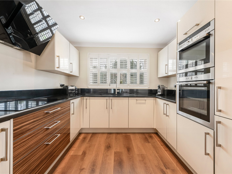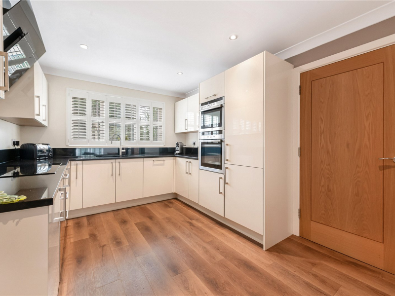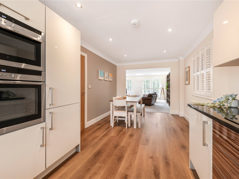 To the right, the open-plan kitchen/dining room overlooks the front garden and is fitted with sleek, modern cupboards and integrated appliances, including an oven, dishwasher, fridge/freezer, and electric hob. There is ample worktop and storage space, as well as room for a freestanding dining table.