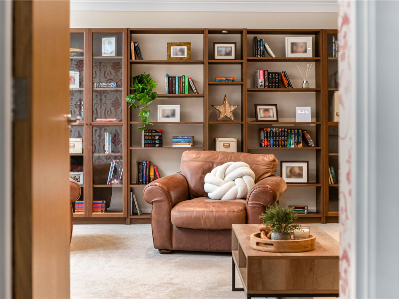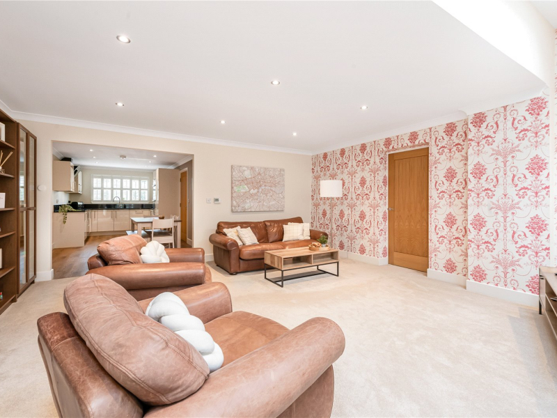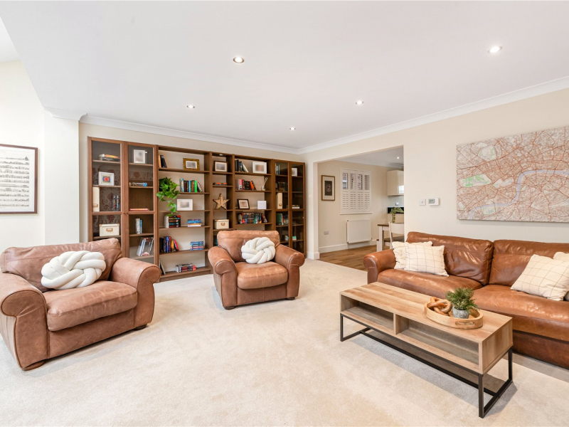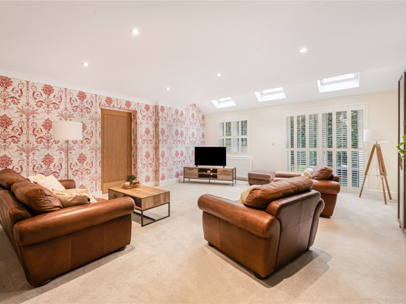 To the rear of the property lies the heart of the home, a spacious living room offering plenty of space for freestanding furniture. This bright and airy room benefits from a built-in storage wall, skylights that flood the space with natural light, and French doors opening onto the garden. From here, there is also access to a separate study.