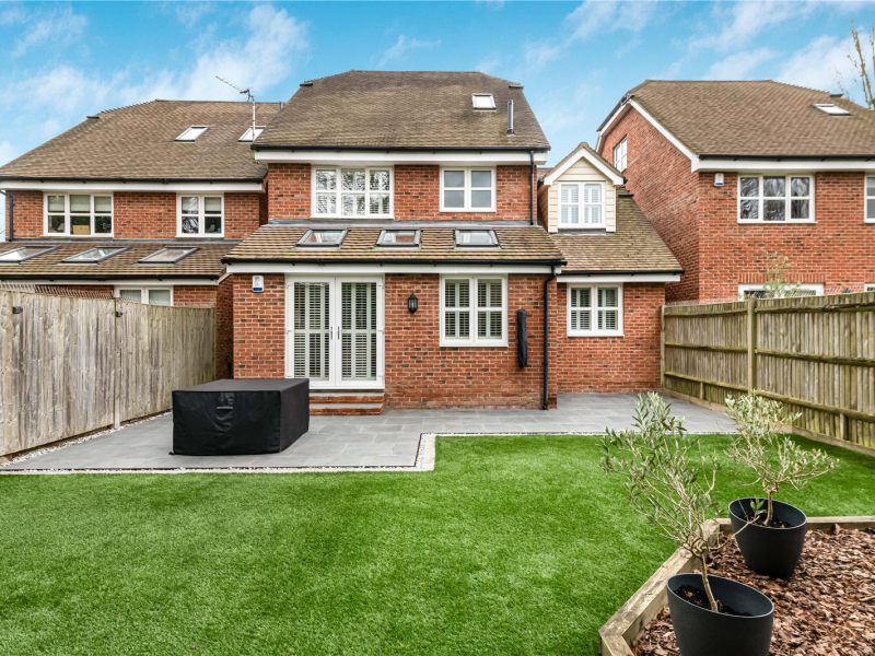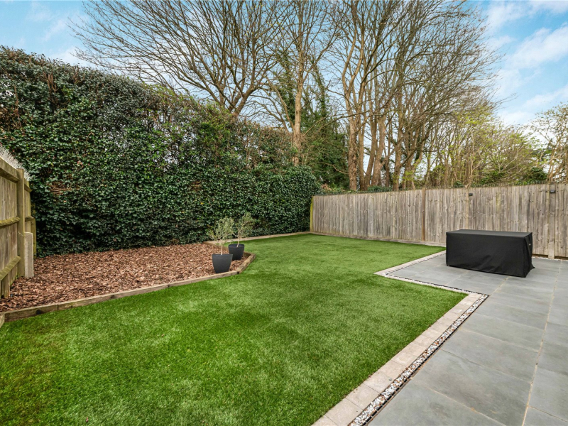 Externally, the rear garden offers a patio area leading onto a well-maintained lawn, with an additional seating area tucked into the corner.