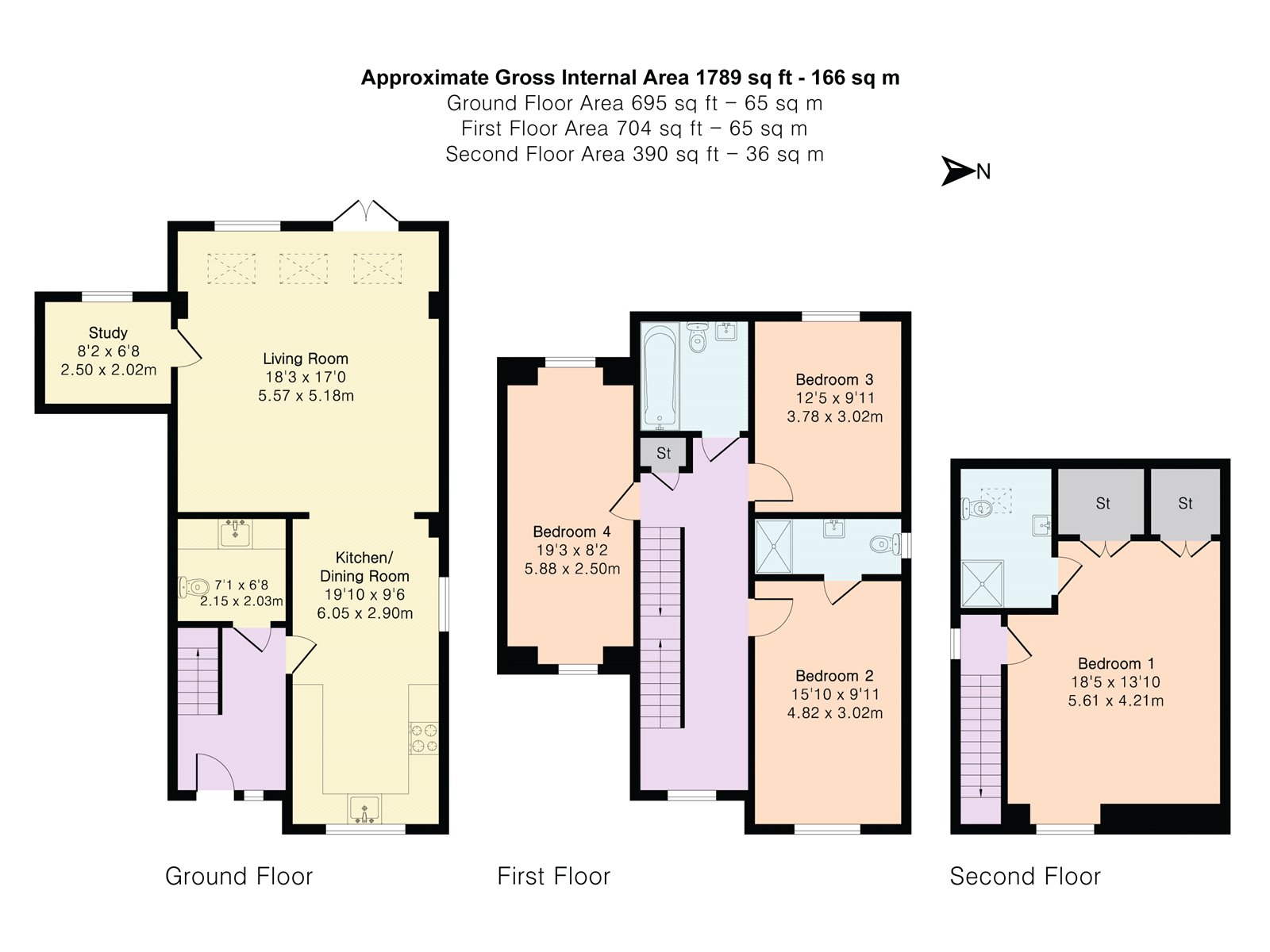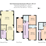 The first floor comprises three generously sized double bedrooms, with the second bedroom benefiting from an en-suite shower room complete with walk-in shower, WC, and wash basin.