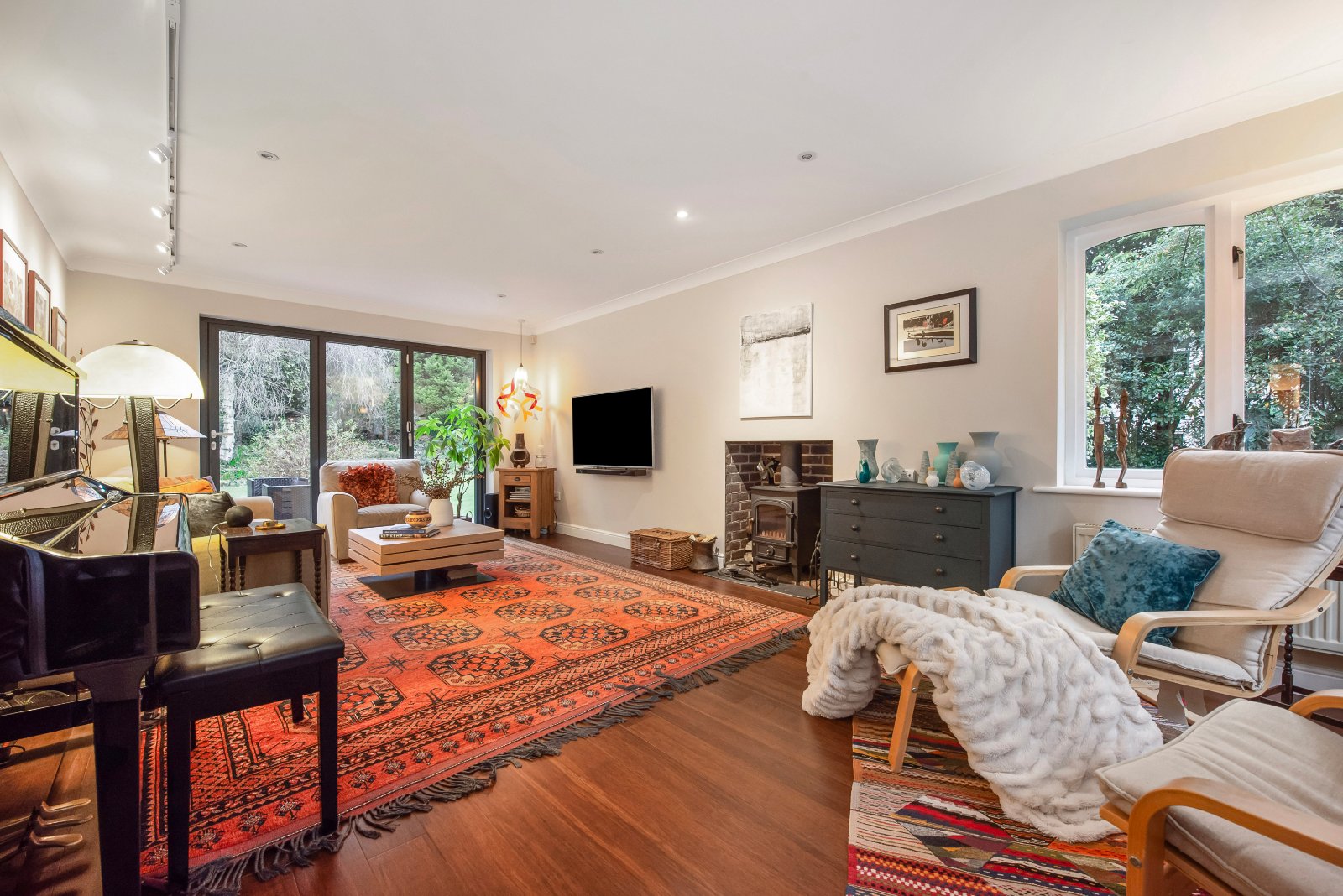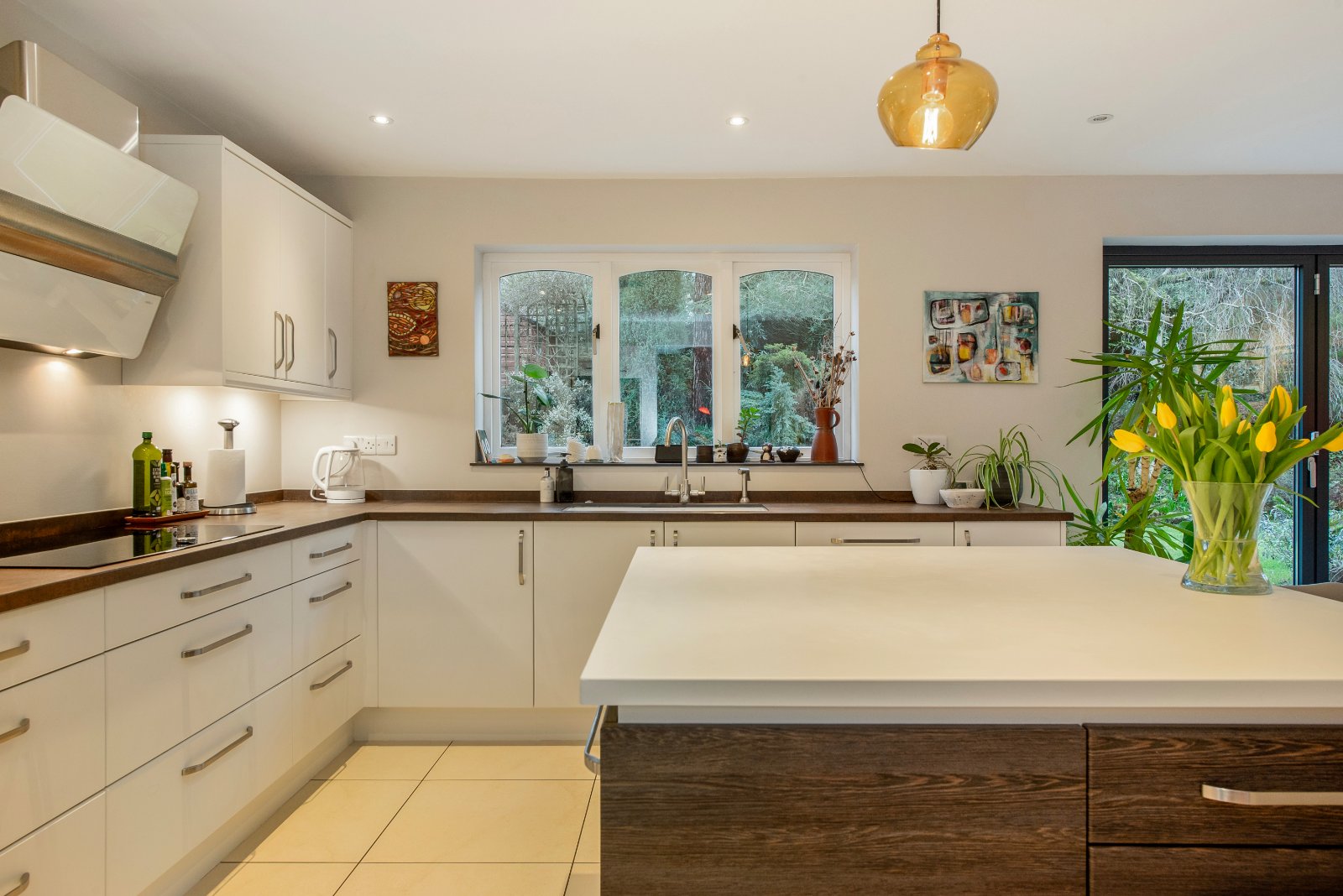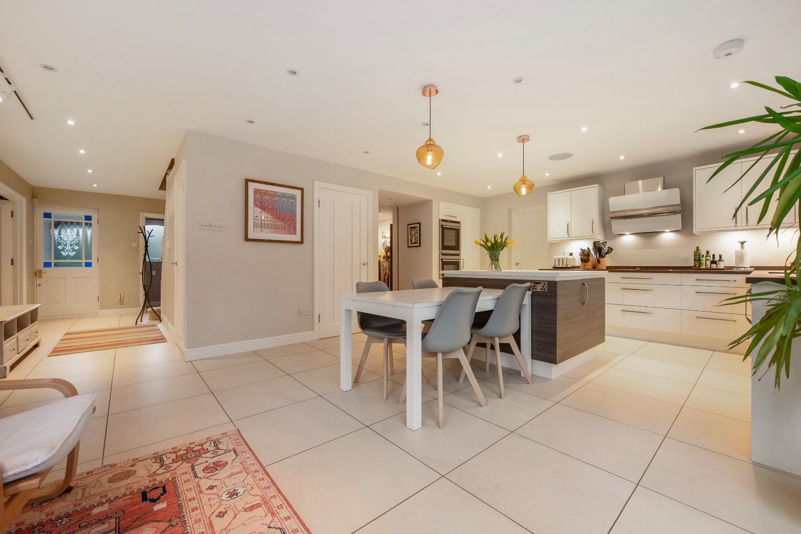 Glazed double doors open into the impressive lounge — a generous triple-aspect room spanning the depth of the property. Bi-fold doors open directly onto the garden, flooding the space with natural light. A full-width built-in bookcase and solid fuel-burning stove create an attractive focal point and add warmth and character. To the opposite side of the hall is the large dining room, featuring a bow window and ceramic tiled flooring. A doorway leads through to the kitchen/breakfast room, undoubtedly one of the home’s standout features. The bright and spacious kitchen/breakfast room offers an extensive range of units, including a practical larder cupboard and central island with generous workspace. Neff integrated appliances include a five plate induction hob, oven, combination microwave oven, fridge and dishwasher. There is ample space for a table and chairs. Ceramic tiled flooring continues throughout, and double-aspect windows along with bi-fold doors provide views over the rear and side gardens. A door leads into the utility room, which also has tiled flooring and provides access to both the garden and the integral garage.