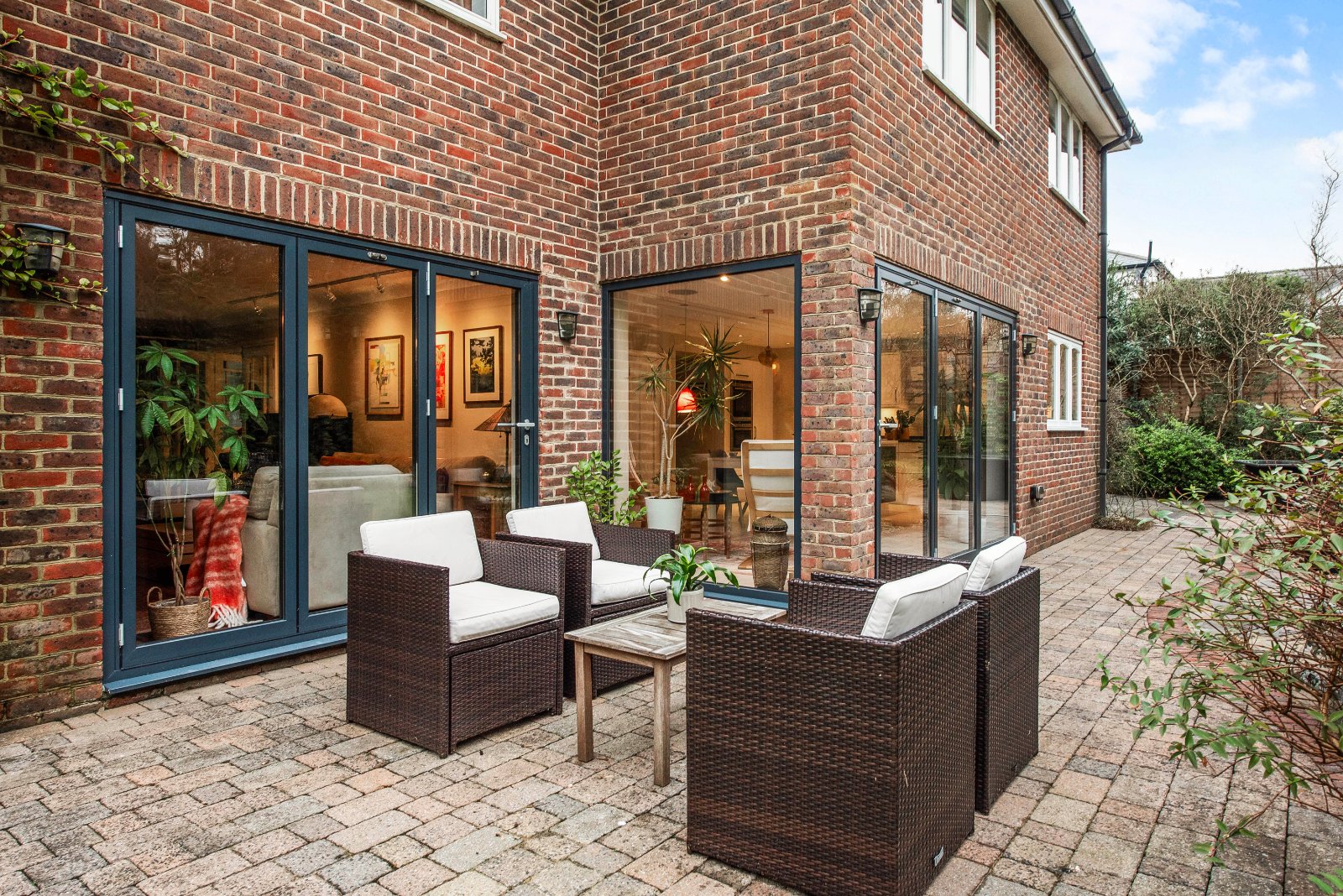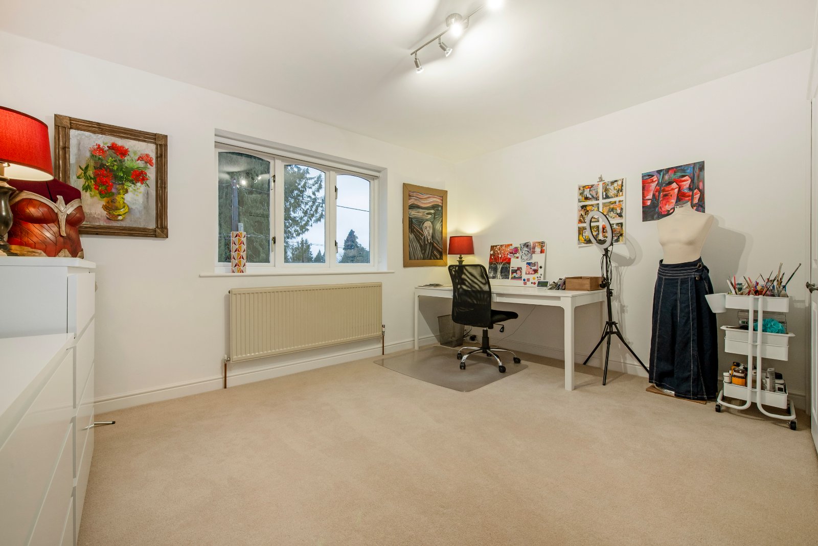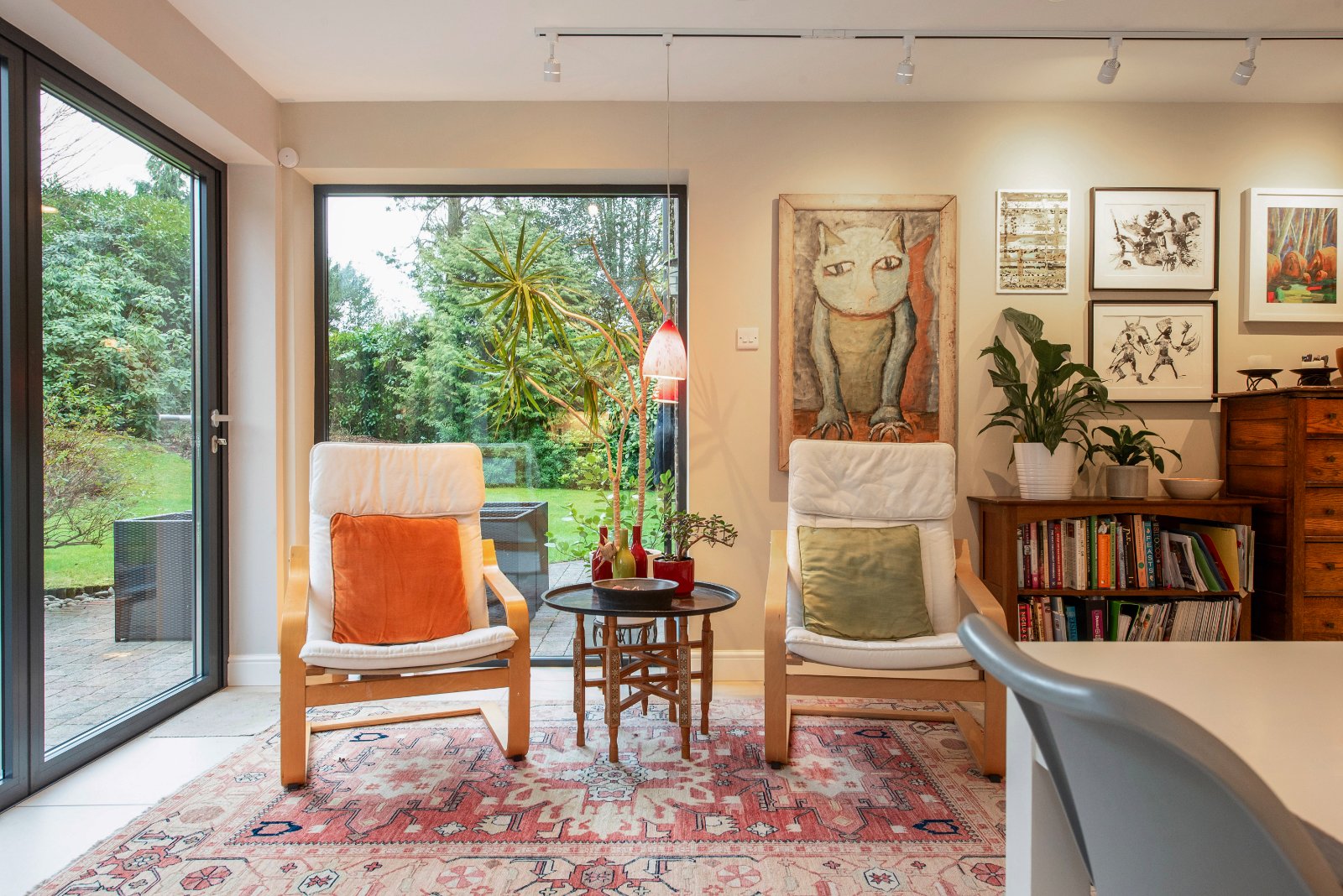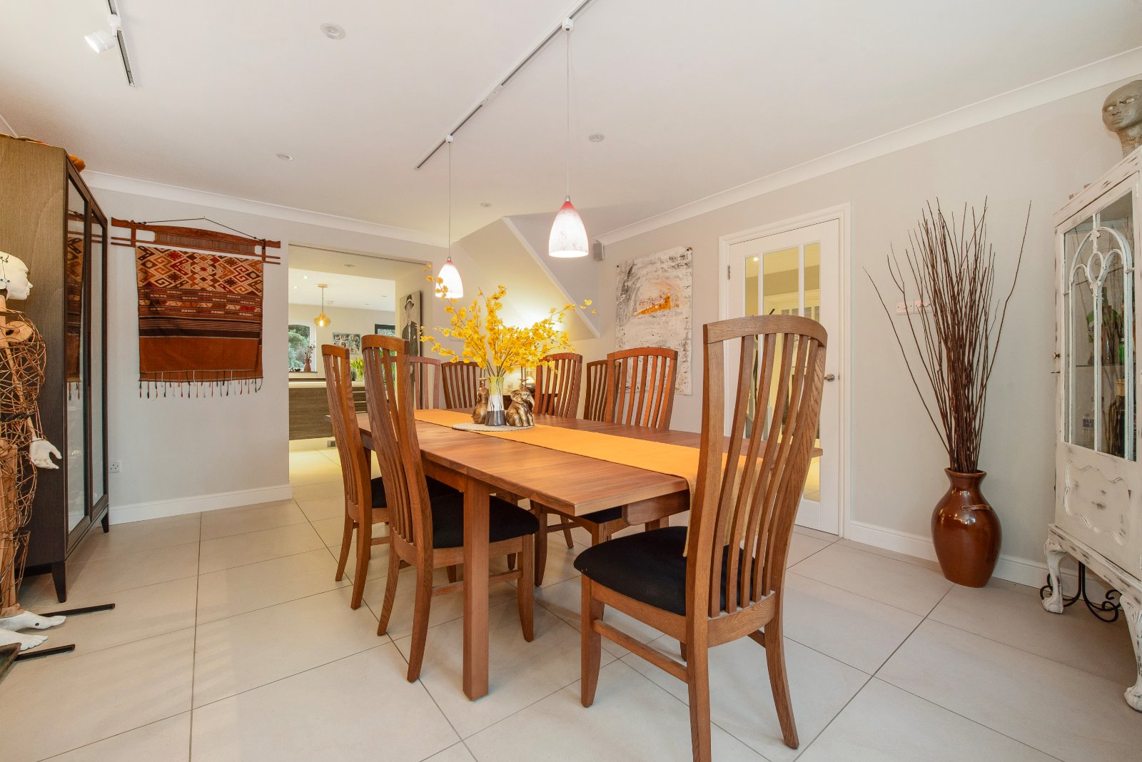 Glazed double doors open into the impressive lounge — a generous triple-aspect room spanning the depth of the property. Bi-fold doors open directly onto the garden, flooding the space with natural light. A full-width built-in bookcase and solid fuel-burning stove create an attractive focal point and add warmth and character. To the opposite side of the hall is the large dining room, featuring a bow window and ceramic tiled flooring. A doorway leads through to the kitchen/breakfast room, undoubtedly one of the home’s standout features. The bright and spacious kitchen/breakfast room offers an extensive range of units, including a practical larder cupboard and central island with generous workspace. Neff integrated appliances include a five plate induction hob, oven, combination microwave oven, fridge and dishwasher. There is ample space for a table and chairs. Ceramic tiled flooring continues throughout, and double-aspect windows along with bi-fold doors provide views over the rear and side gardens. A door leads into the utility room, which also has tiled flooring and provides access to both the garden and the integral garage.