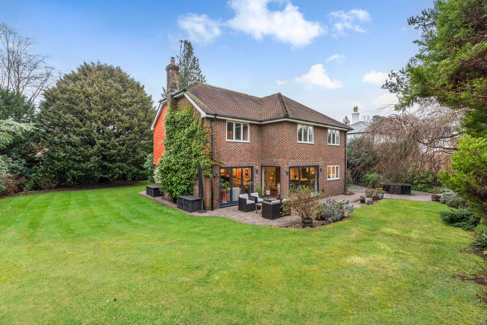 To the first floor, a spacious landing provides loft access and a large cupboard. The principal bedroom is a well-proportioned room with built-in wardrobes and views over the rear garden. The luxurious en-suite bathroom features tiled flooring and predominantly tiled walls, a large walk-in shower, freestanding deep bath, WC and stylish vanity unit with bowl sink set on a worksurface with drawers beneath. There are four further double bedrooms. The family bathroom is fitted with a modern white suite complemented by eye-catching aqua tiling.
