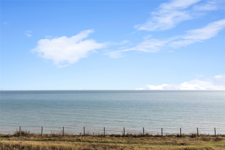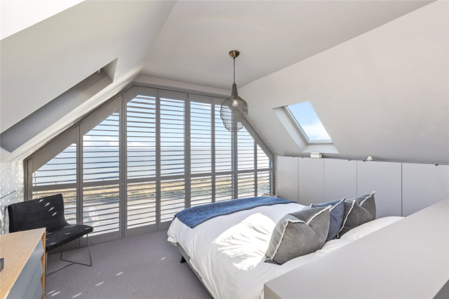 Accommodation is generous. The ground floor includes a flexible bedroom or office and a guest WC, while upstairs offers three further double bedrooms and two bathrooms. The principal suite makes the most of the coastal position, with sweeping sea views that shift in mood with the light and weather.