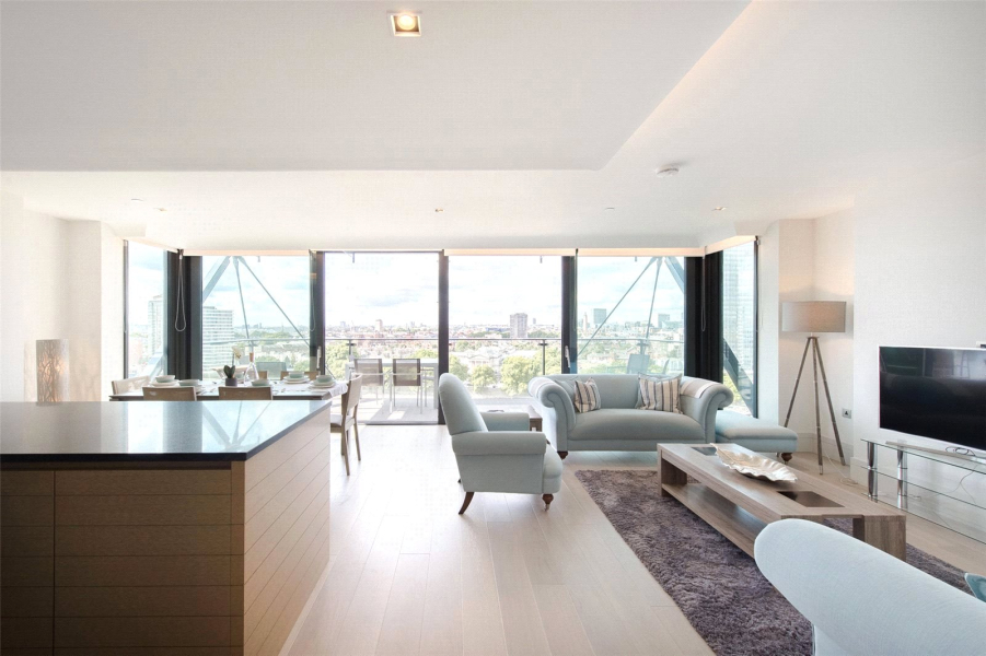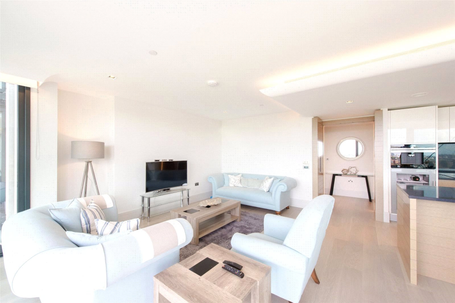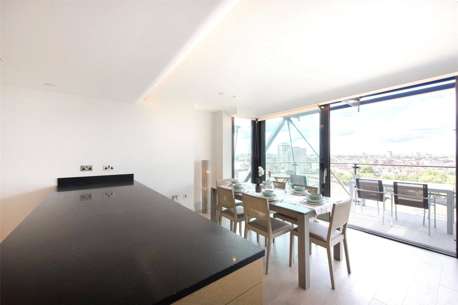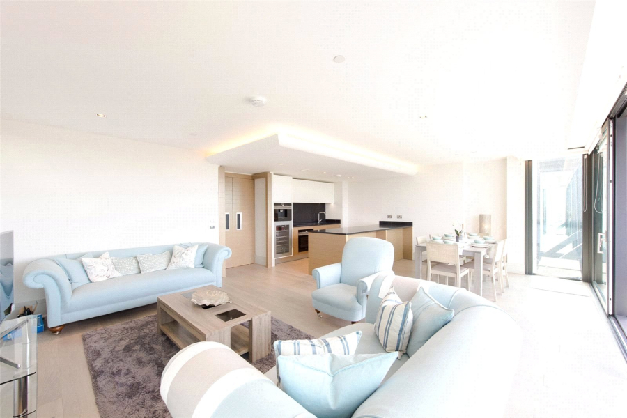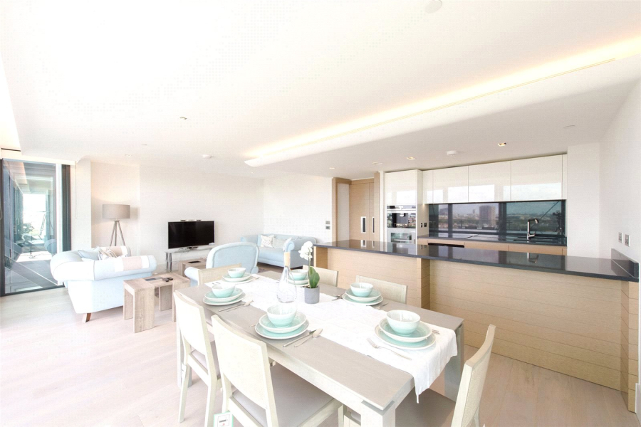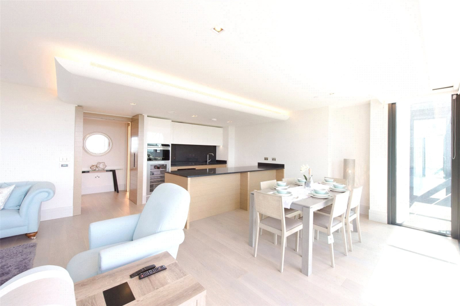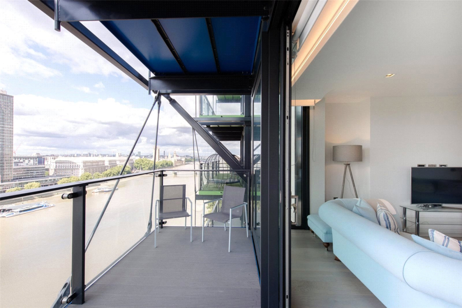 This beautifully presented two-bedroom, two-bathroom apartment spans approximately 1,177 sq.ft (109 sq.m) and showcases a truly impressive reception room with floor-to-ceiling windows framing sweeping views of the River Thames, the Houses of Parliament, and Big Ben. The generous private balcony provides the perfect setting for morning coffee or evening entertaining against the glittering London skyline.