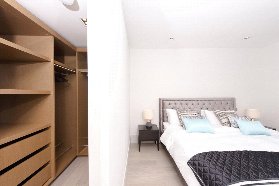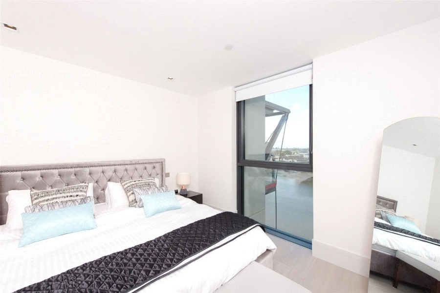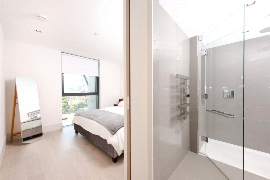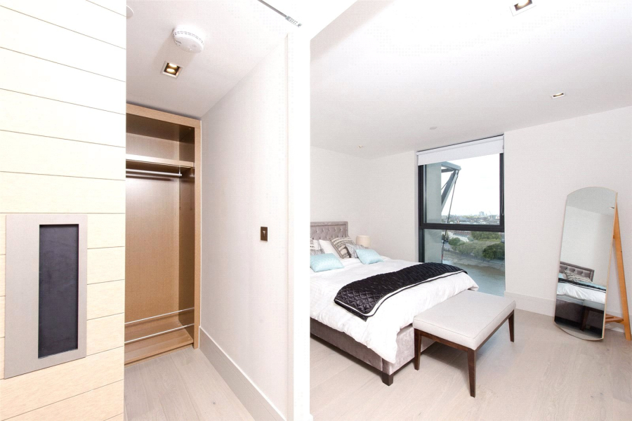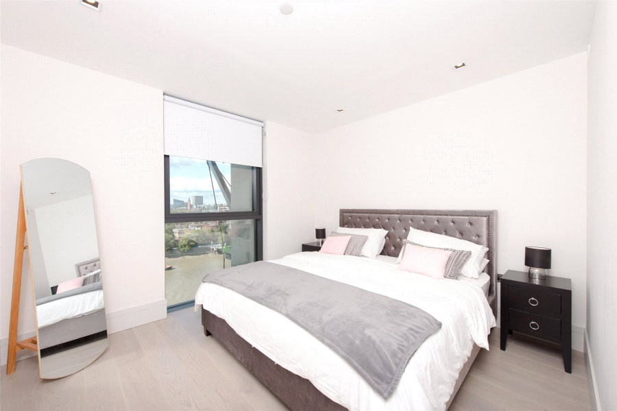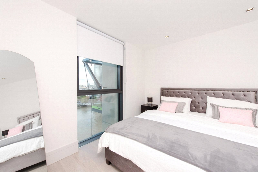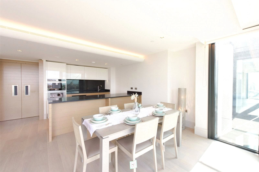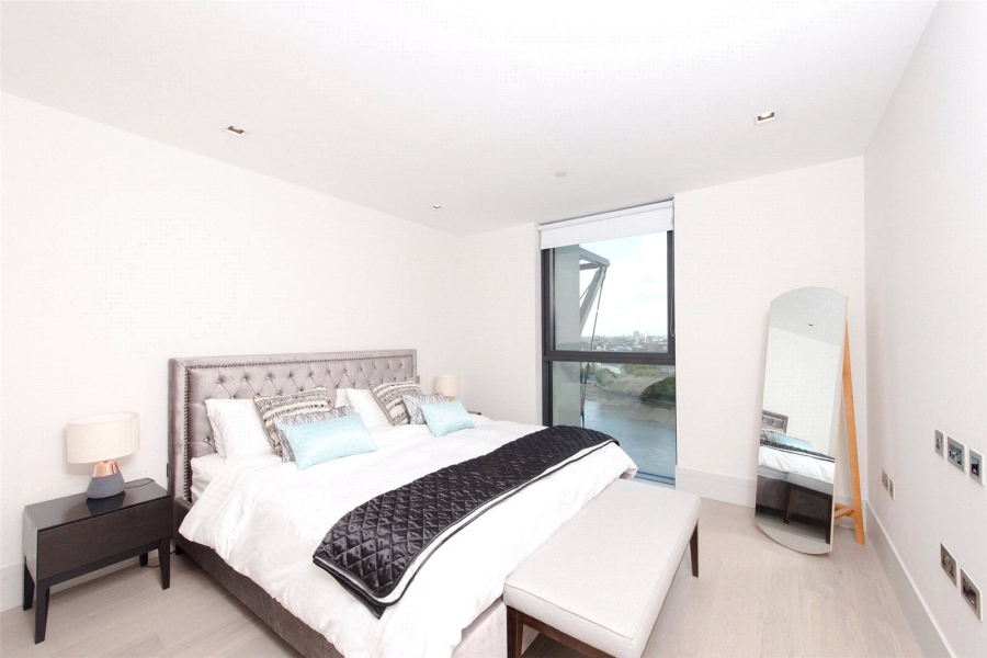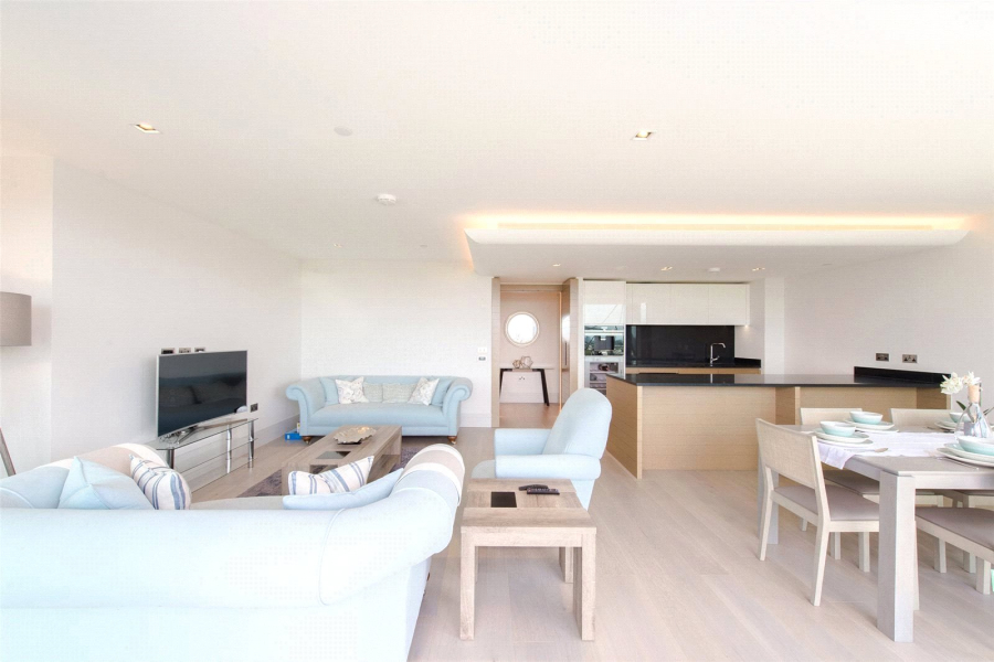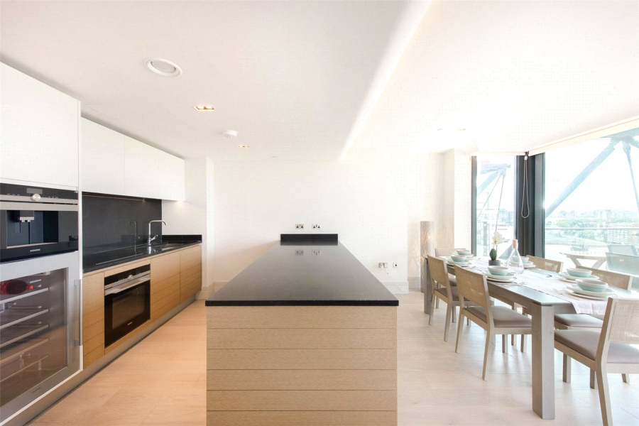 The open-plan kitchen is elegantly finished with high-quality appliances and contemporary cabinetry, seamlessly blending with the spacious living area and engineered wooden flooring throughout. Both double bedrooms feature bespoke fitted wardrobes and river views, while the principal suite includes a luxurious en-suite bathroom. A second modern bathroom completes this outstanding home.