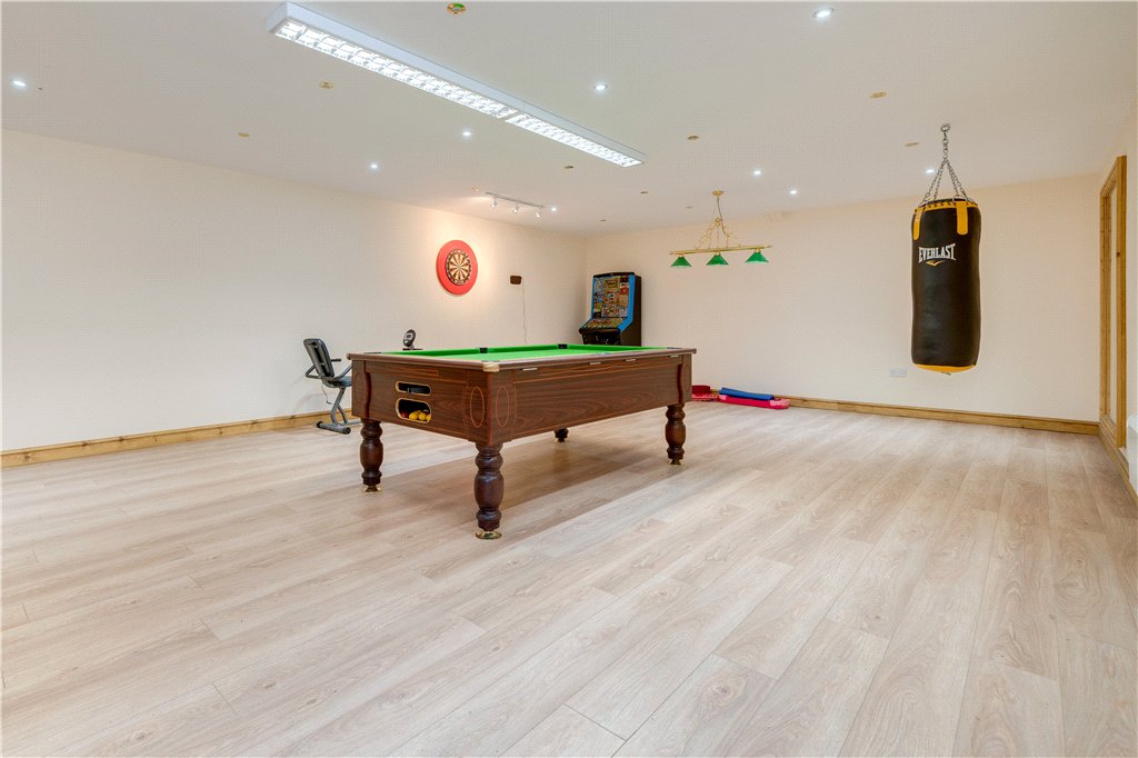 Practicality is also well catered for with a larger-than-average garage, complete with a mezzanine floor that offers excellent storage or workshop potential. Beyond this sits an additional games room, a highly versatile space that could equally serve as a hobby room, gym, studio, or further entertainment area. The parking area is also vast with electric charger.