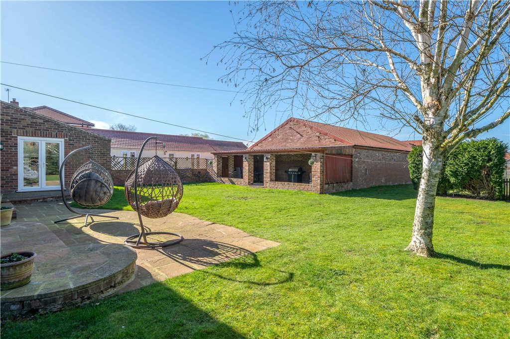 Externally, the grounds are equally impressive. The gardens extend to the rear of Becklands and are generous in scale, predominantly laid to lawn and arranged in a large L-shape, providing a wonderful sense of space and privacy. A particularly attractive feature is the covered brick-built outdoor seating area, ideal for year-round entertaining, al fresco dining, or simply enjoying the peaceful surroundings.