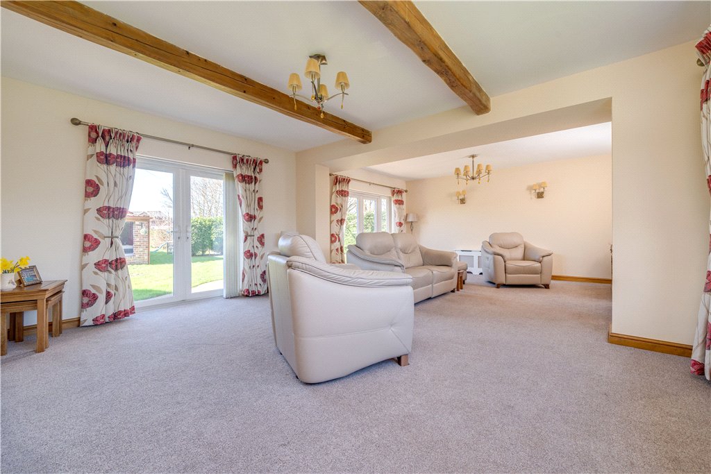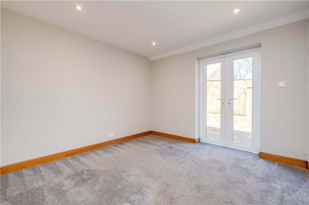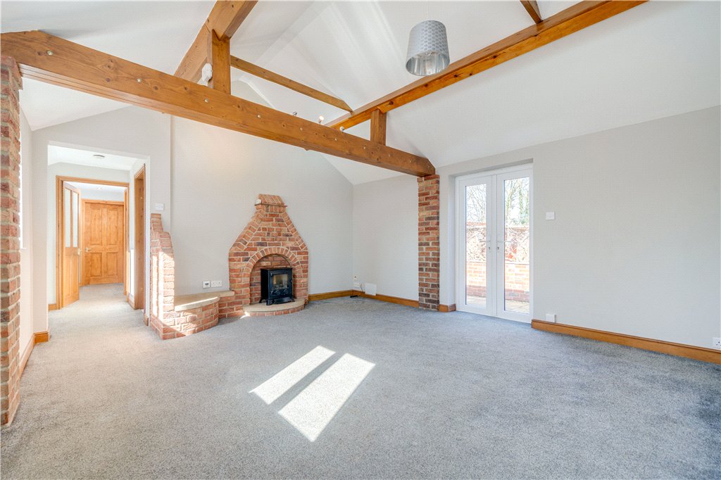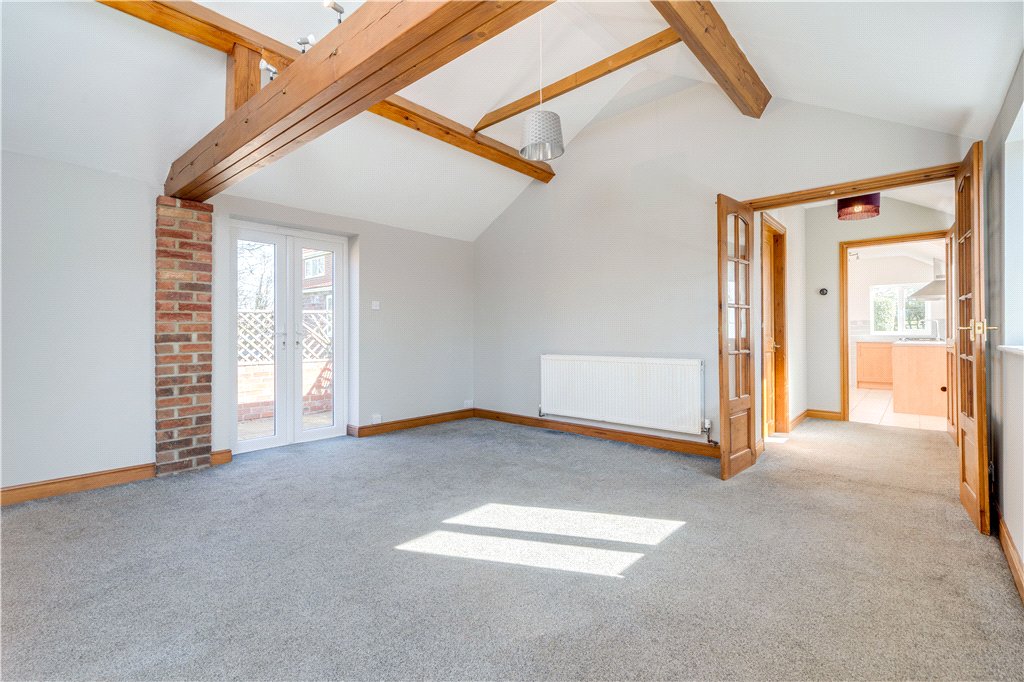 Attached to the main residence is Becklands Lodge, a charming and beautifully presented single-storey dwelling that provides a fully self-contained living space. Perfect for extended family members or independent living, the lodge offers a modern fitted kitchen, three comfortable double bedrooms, and a wonderful open-plan living area. This inviting space is enhanced by vaulted ceilings and a feature fireplace, creating an airy and characterful environment, while French doors open onto a private patio, allowing the indoor living space to flow seamlessly into the garden beyond. Importantly, the configuration of the property means that Becklands and Becklands Lodge could potentially be connected internally, creating one substantial residence should a purchaser wish, further emphasising the property’s remarkable adaptability.