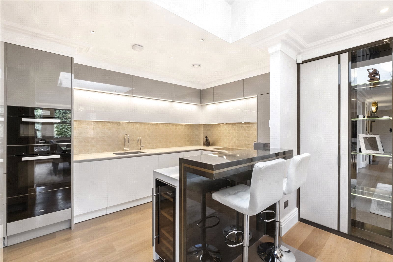 The kitchen is fully equipped with Miele appliances, a built-in wine fridge, and a rare purified drinking water system with integrated carbonation.