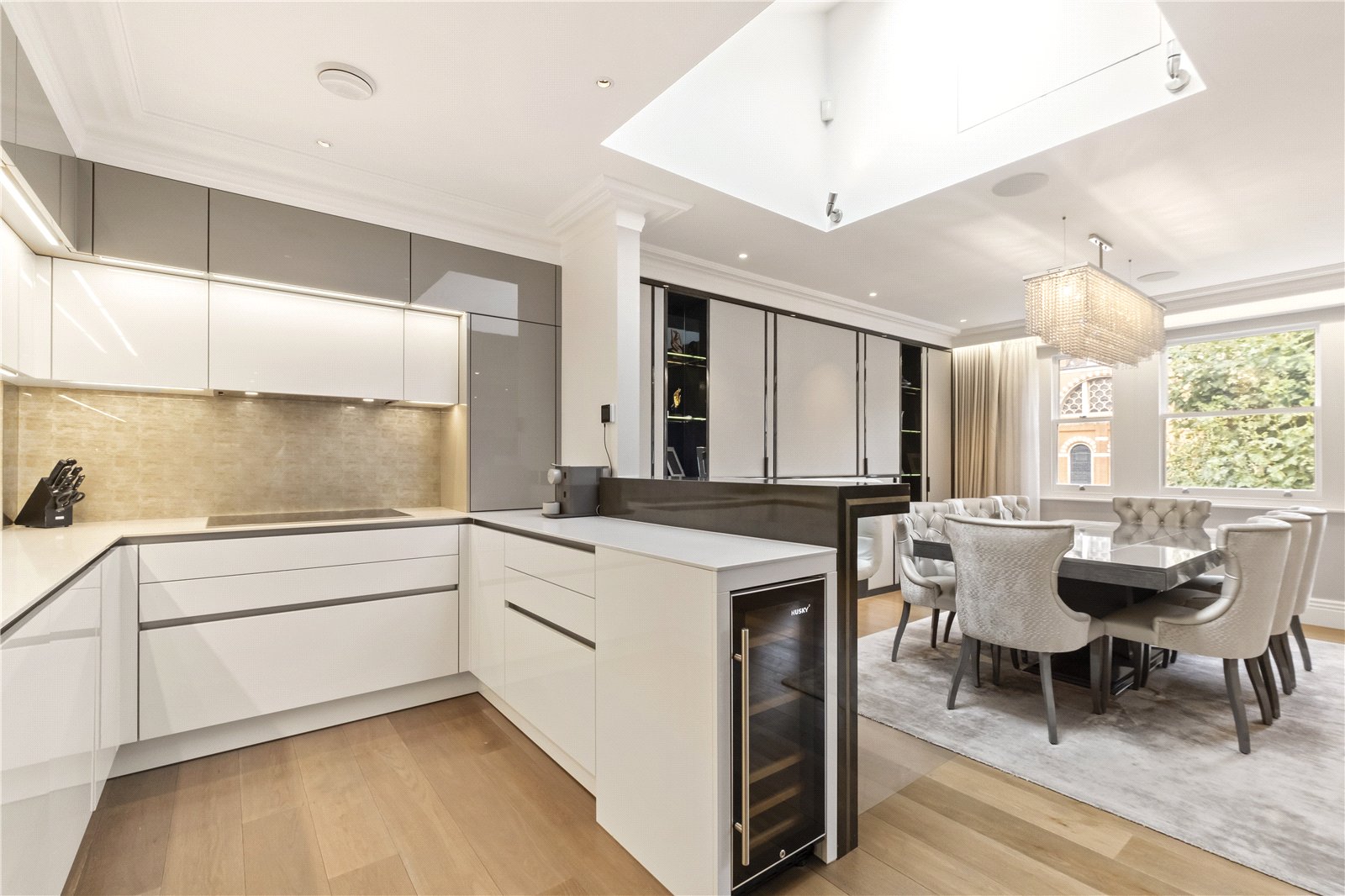 The kitchen is fully equipped with Miele appliances, a built-in wine fridge, and a rare purified drinking water system with integrated carbonation.