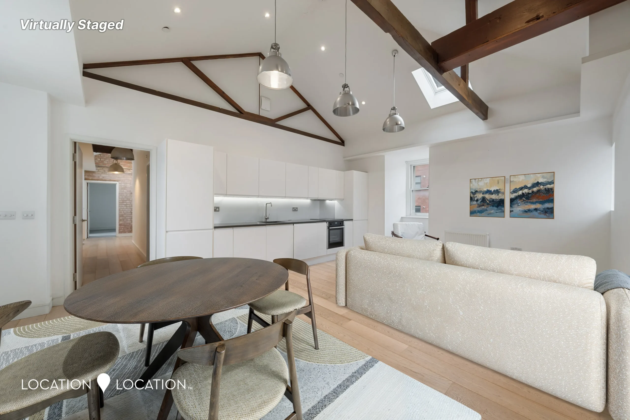 At over 1,500 sq. ft., the apartment boasts three spacious bedrooms, two bathrooms, plus a stunning living space with vaulted ceilings and exposed original beams.