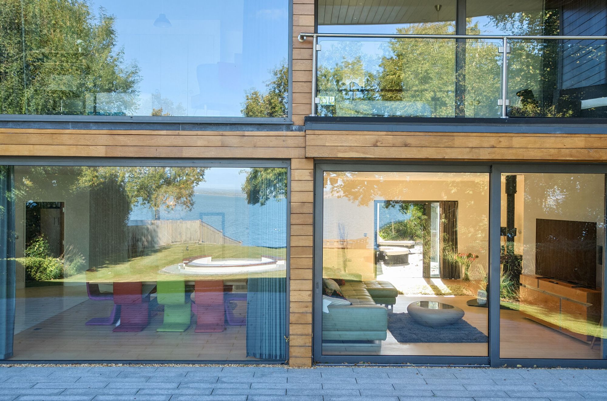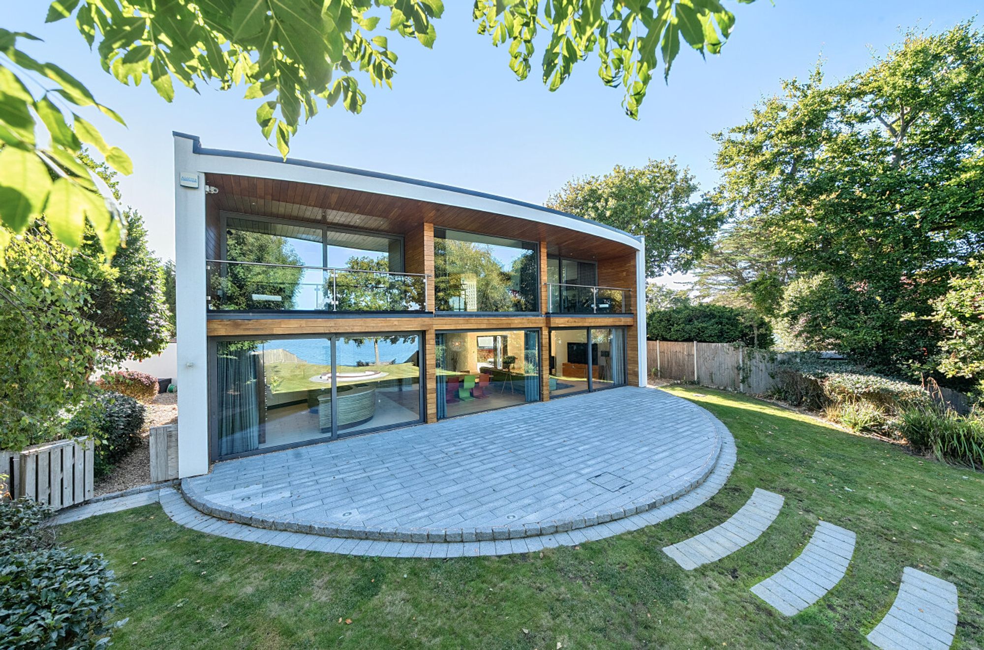 Extending to over 4000sqft the accommodation is centred around a dramatic double-height atrium with sweeping circular staircase — an architectural focal point that sets the tone for the entire house. At its heart, a spectacular open-plan kitchen, dining, and living area opens onto sun terraces and gardens, with floor-to-ceiling glazing ensuring the ever-changing seascape is a constant presence. The addition of a log burner brings warmth and character to the modern design.