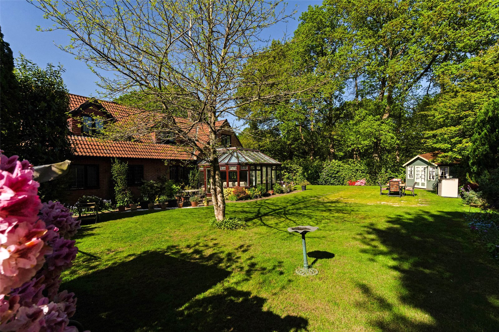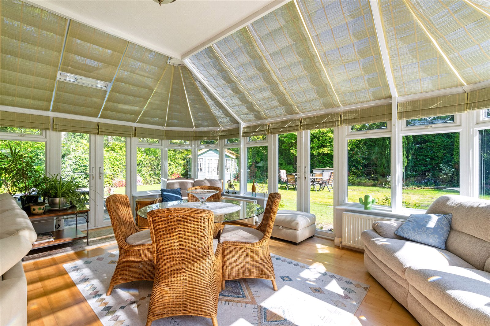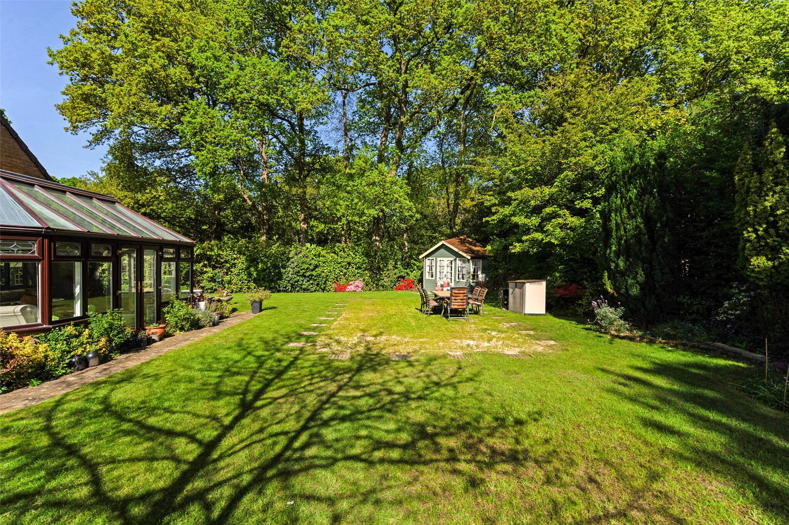 Externally, the property benefits from driveway parking for multiple vehicles and a double garage with electric doors. Side access leads to the private, non-overlooked south facing rear garden, which spans approximately 0.25 acres. The garden wraps around the house and is landscaped and mature. It is well stocked with select shrubs and flowers, with large areas of lawn, 2 patio areas, a summer house, 2 sheds a greenhouse, and a vegetable plot.
