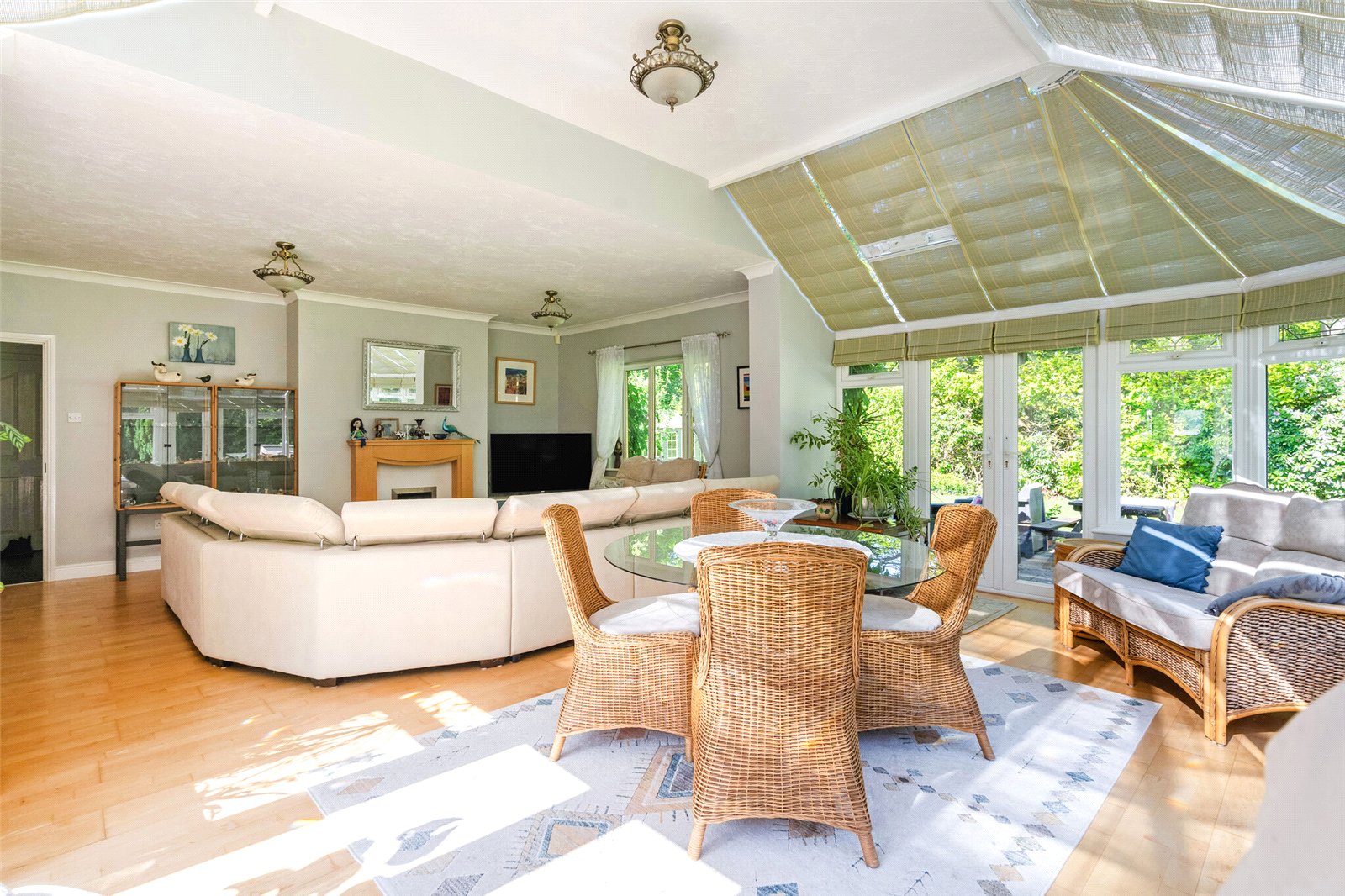 Upon entering, you are greeted by a large, welcoming entrance hall that flows into a stunning living room, which opens onto a large conservatory. The conservatory is triple aspect, offering secluded views to most of the wraparound rear garden. The generous kitchen / dining room with fitted fridge and dish washer is complemented by a separate utility room with a water softener, plumbing and electrics for a washing machine and a fitted full height freezer. There are 3 additional reception rooms, including a snug that could serve as an extra double bedroom. A shower room completes the completes the ground floor.