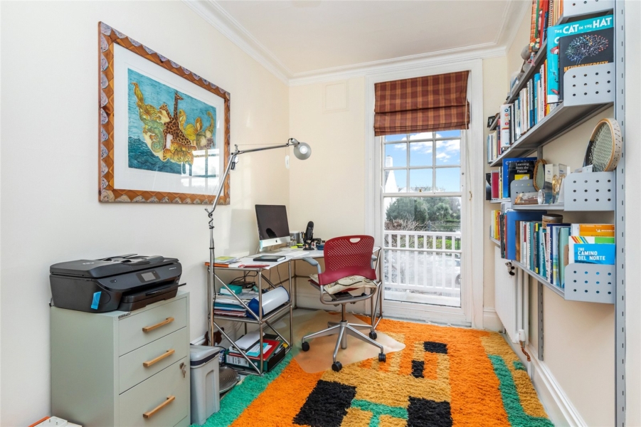 The first floor provides three of the home’s five bedrooms along with two bathrooms. A well-presented family bathroom sits on the half landing. There are two bedrooms to the front, the larger enjoys wide aspect views over Pembroke Crescent and features a gas fireplace, making it a potential candidate for a principal bedroom if desired. Adjacent is an ideal home office, nursery or single bedroom, complete with sash window and access onto a charming balcony.