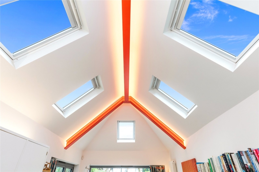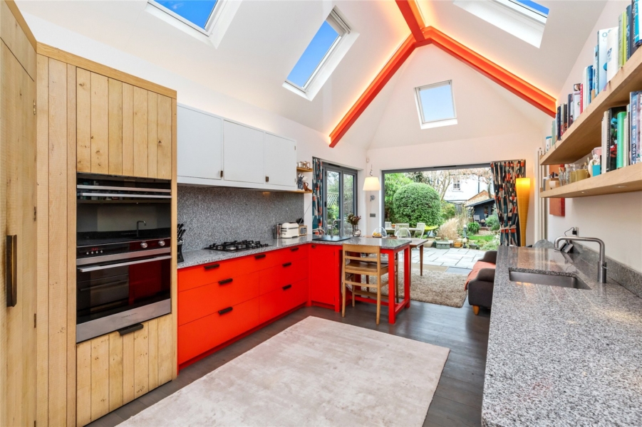 The cabinetry is finished in a rich crimson tone, perfectly complemented by exposed steel elements within the ceiling structure. There is extensive worktop space, a built-in pantry for additional storage and a suite of Fisher and Paykel appliances, all combining to create a kitchen that is as functional as it is visually compelling. A downstairs W.C and understairs storage complete the ground floor.