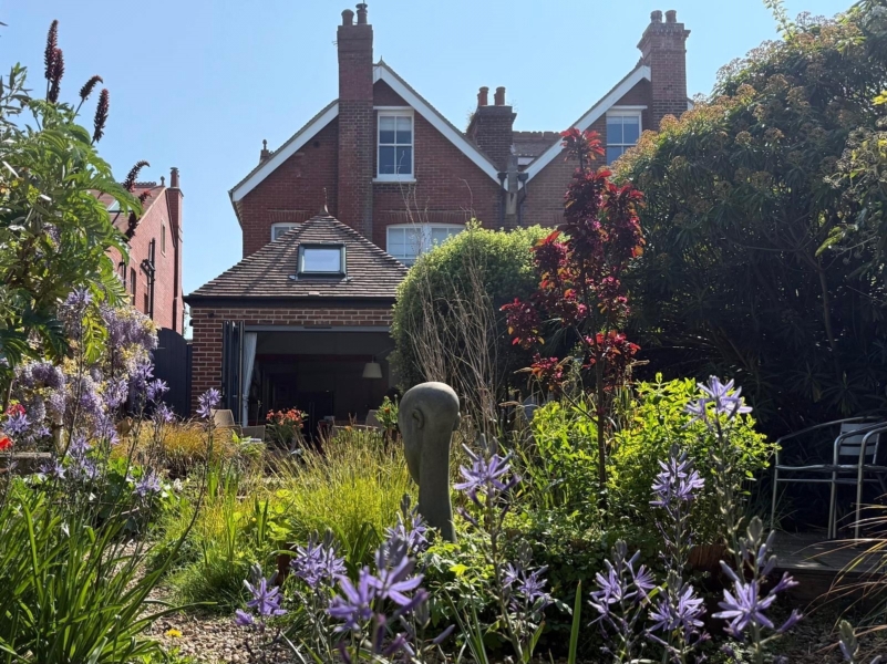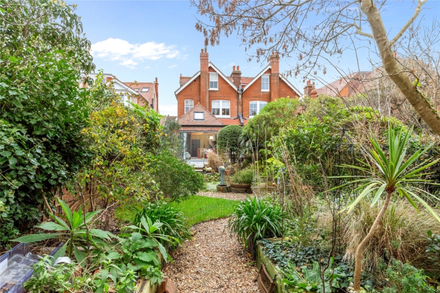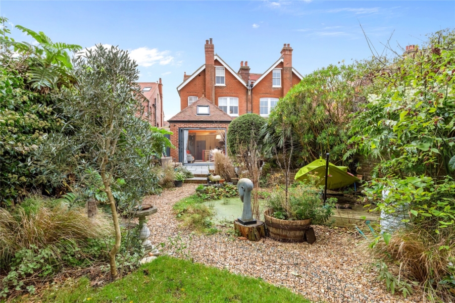 The west facing rear garden has been thoughtfully landscaped to create a secluded and characterful oasis. Long in length, it begins with a substantial patio and side return, with secure gated access ideal for bike storage. The garden then unfolds via a meandering stone path, passing a variety of established planters and flowers and a tranquil pond with decked hammock area.