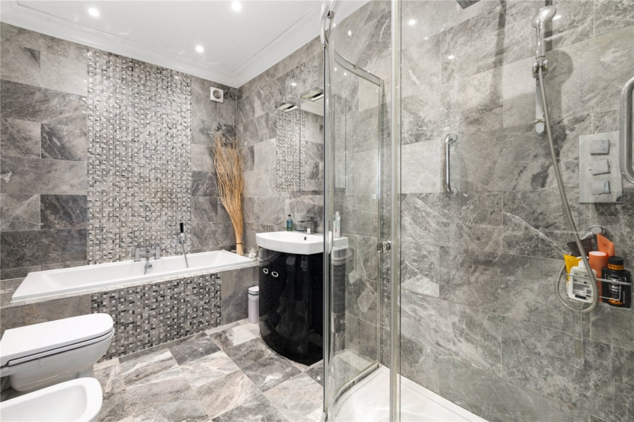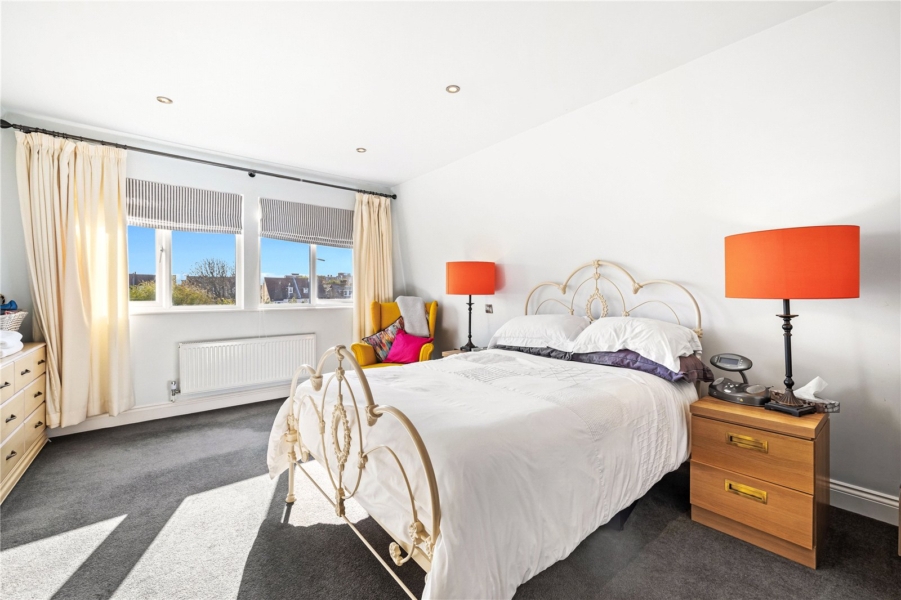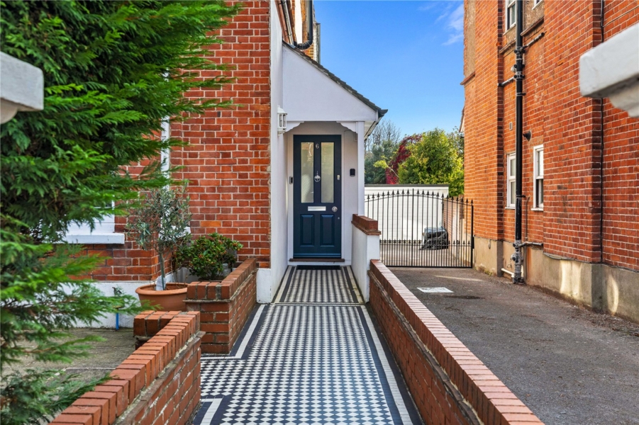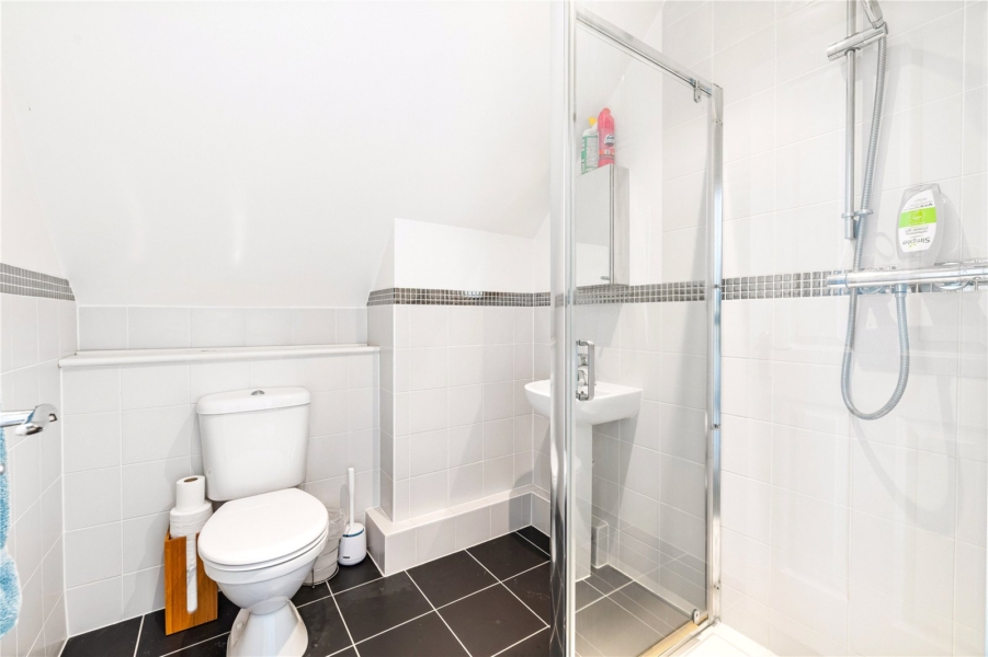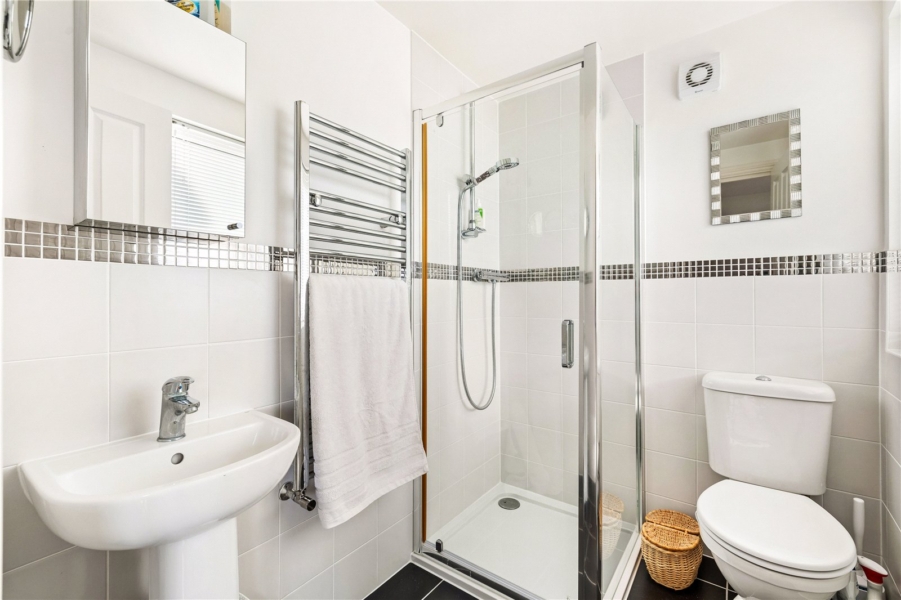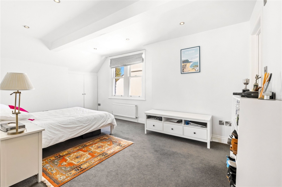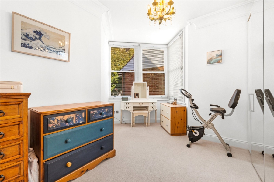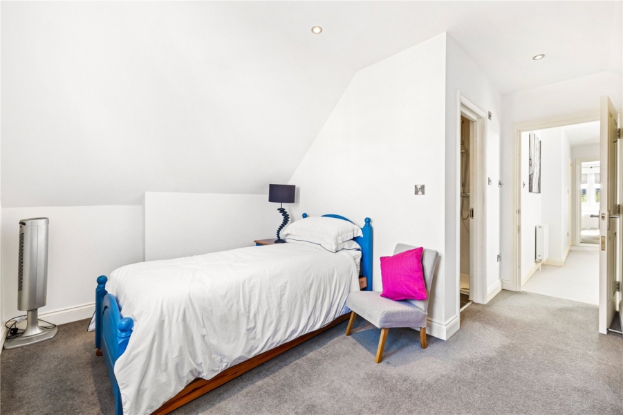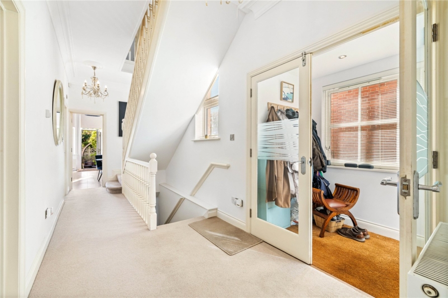 On the first floor, a spacious landing leads to three well proportioned rooms. There is a generous double bedroom, a versatile study, nursery or dressing room, and a modern family bathroom. The principal bedroom is a standout, with excellent built in storage and a sleek ensuite shower room.