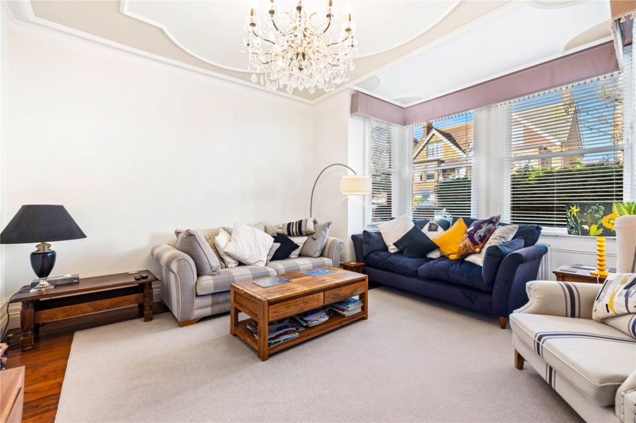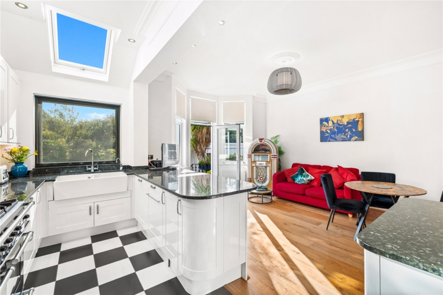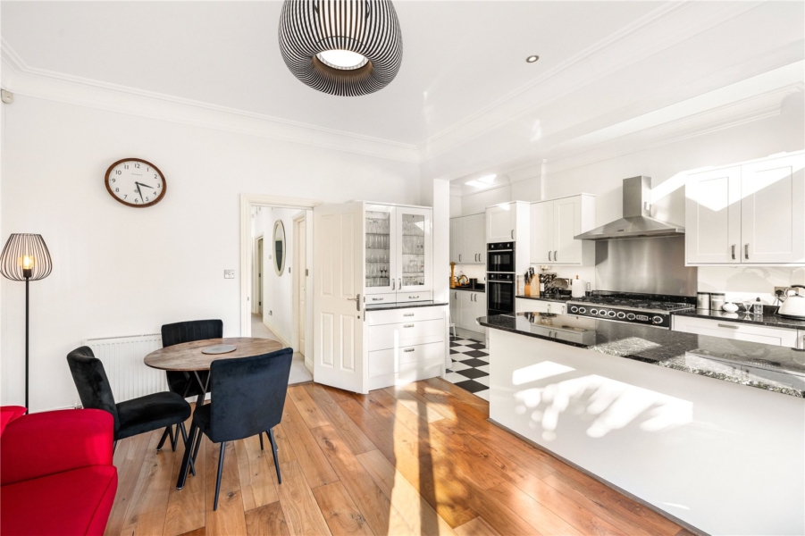 As you step through the porch, the sense of space and scale is immediately apparent. At the front, a wonderfully secluded living room with high ceilings and double glazed sash windows provides a perfect private retreat at the end of the day. Next door, elegant glass French doors open into a formal dining room, an ideal setting for hosting dinners with friends and family.