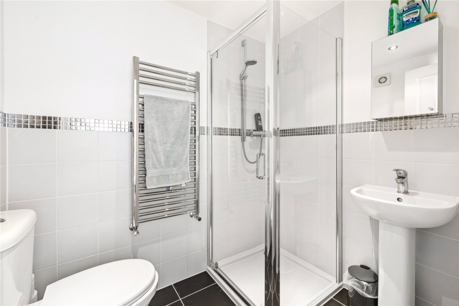 On the first floor, a spacious landing leads to three well proportioned rooms. There is a generous double bedroom, a versatile study, nursery or dressing room, and a modern family bathroom. The principal bedroom is a standout, with excellent built in storage and a sleek ensuite shower room.