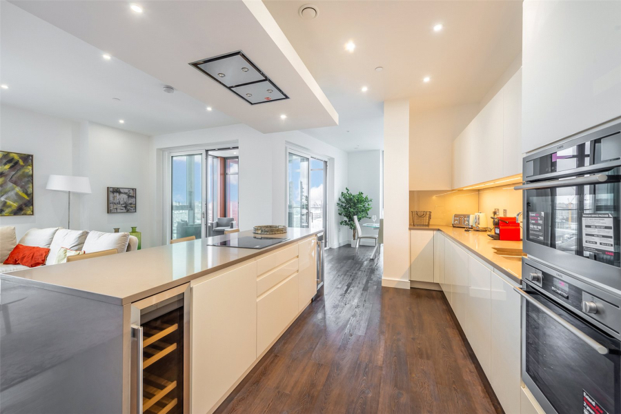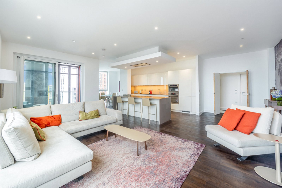 This impressive penthouse occupies the whole of the 18th floor of Pinto Tower at Nine Elms Point , one of the most popular addresses in the Nine Elms regeneration zone. The living room faces south west and is flooded with light from the floor to ceiling windows. The kitchen is open plan with a large island separating it from the living area. From the large reception room you also find the winter garden and balcony perfectly positioned on the south western corner of the property making it an ideal place to enjoy the evening sun.