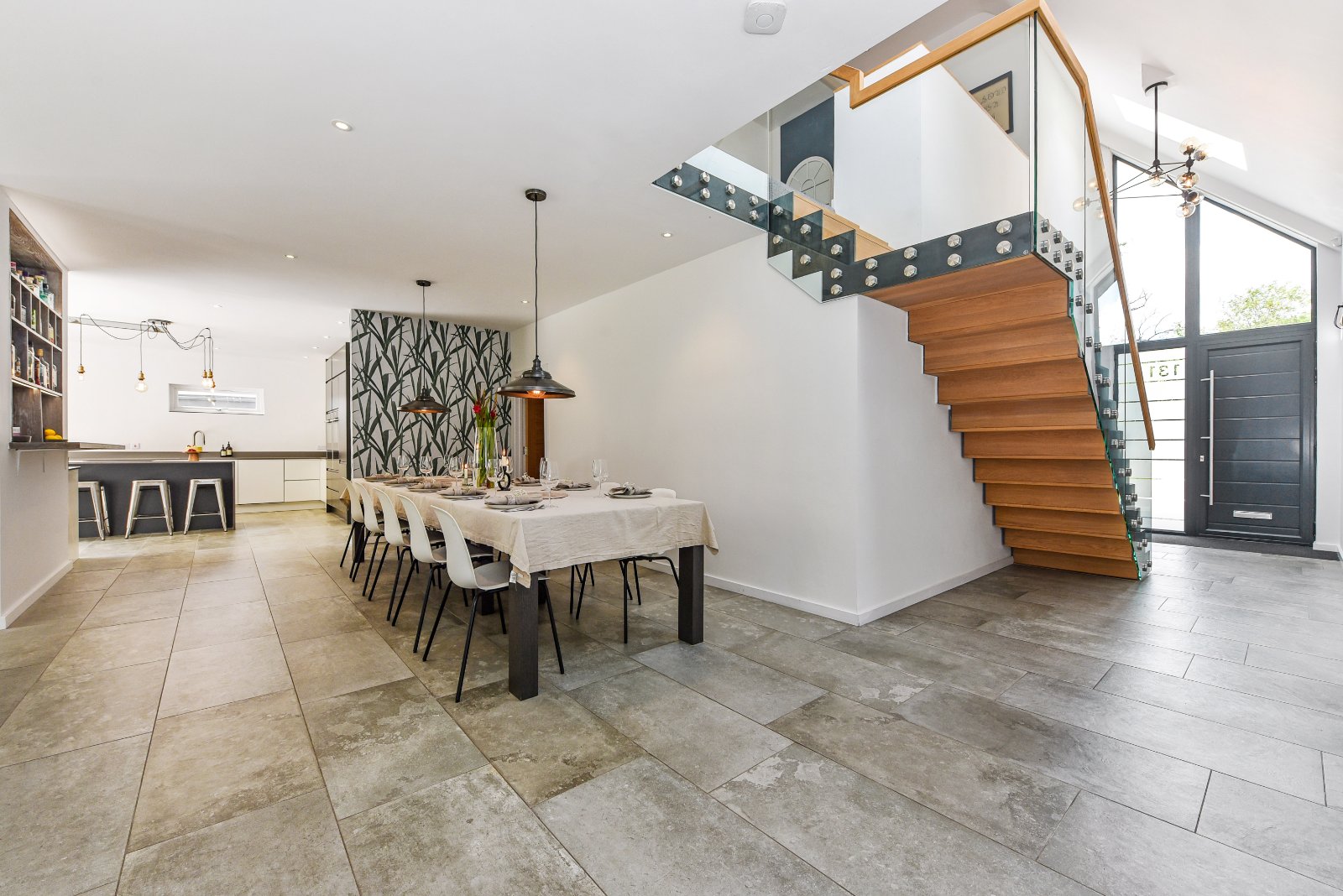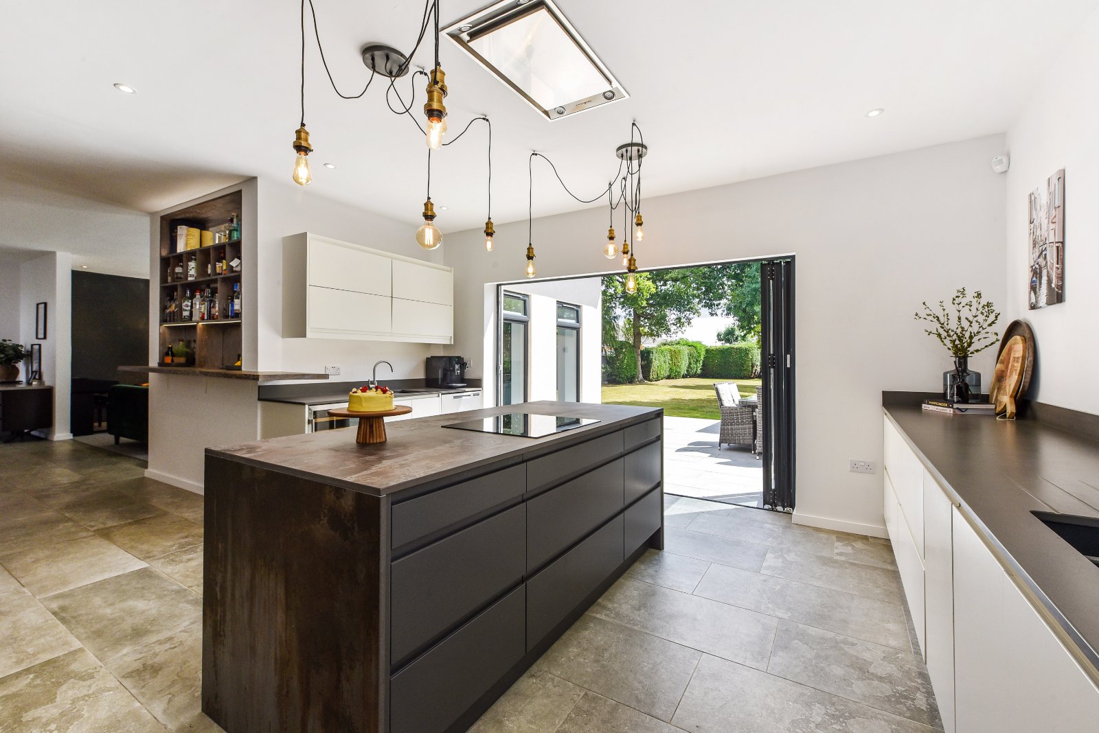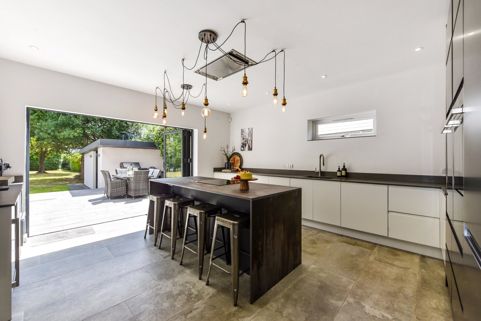 Upon entering the property, you will immediately be struck by the generous sized entrance hallway with vaulted ceiling and feature timber staircase with glazed and wooden banister. The hallway leads into the dining room with space enough for a large dining table and at least 10 chairs. A shelved and mirrored wall with concealed lighting provides a nice focal point to this room and is adjacent to the entrance into the 23ft x 17ft living room. This room is a great space for entertaining and has a stunning feature fireplace set between two sets of sliding doors that open out onto the garden terrace.
